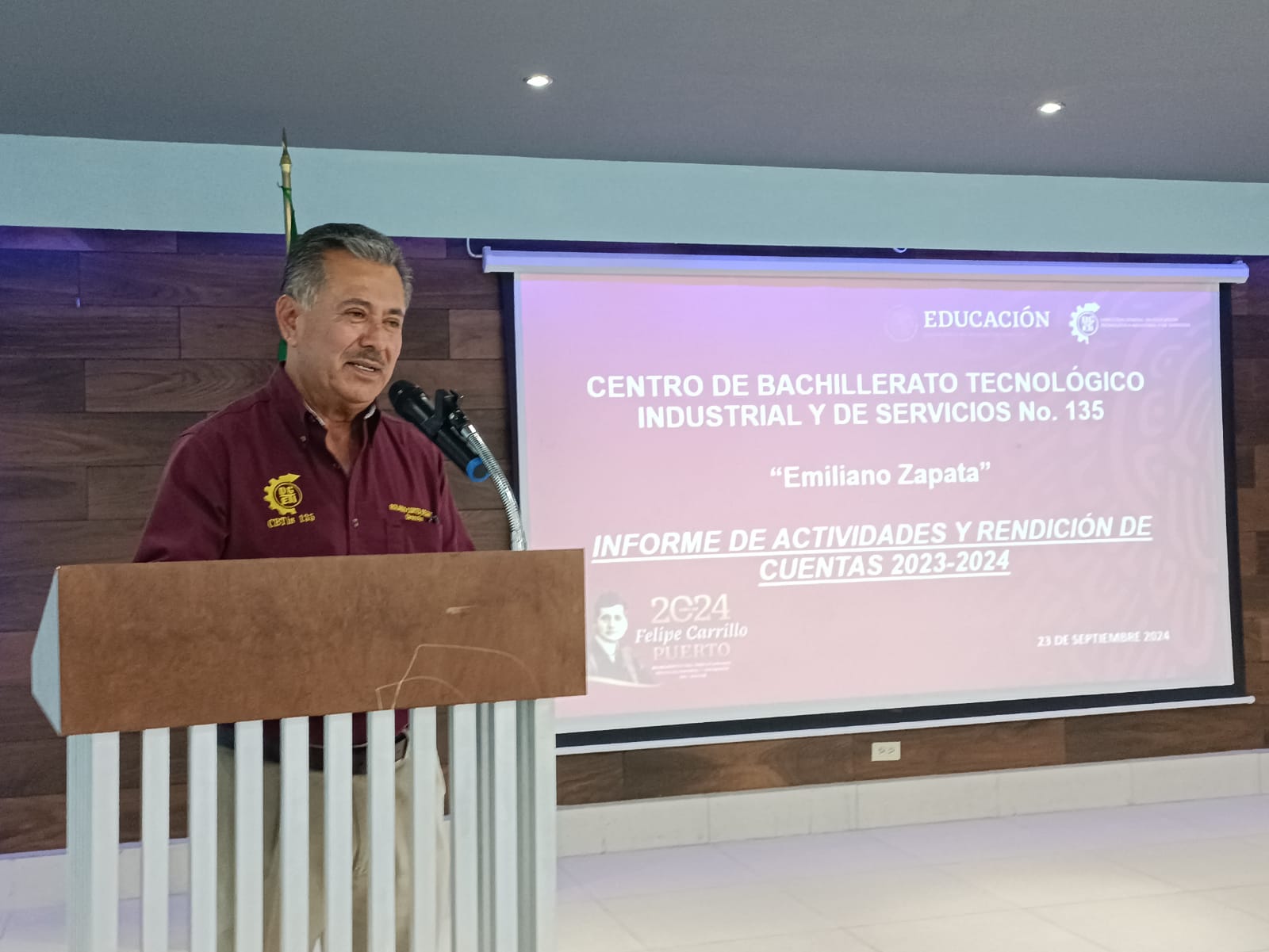 Ante la presencia de alumnos, padres de familia, personal administrativo y docente, el director del Cbtis 135, maestro Rolando Cortés Delgado, ofreció su Informe de Actividades y Rendición de Cuentas 2023 – 2024, acto que se desarrolló en la sala audiovisual de éste centro educativo.