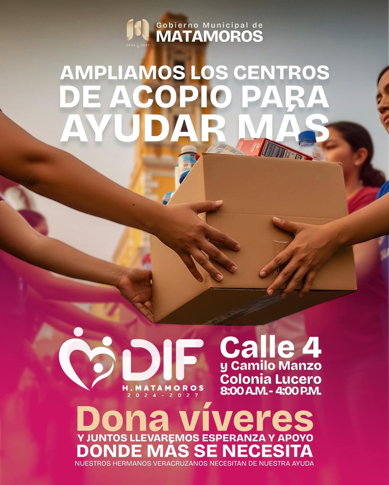 Esta acción se realiza en coordinación con el Gobierno Municipal de Matamoros, con el objetivo de brindar apoyo y esperanza, por ello se ha habilitado un centro de acopio en las instalaciones de DIF Central, ubicadas en la esquina de Calle 4 y Camilo Manzo. En este espacio, la comunidad matamorense podrá donar alimentos no perecederos, artículos de higiene personal, productos de limpieza, ropa en buen estado y otros artículos de primera necesidad.