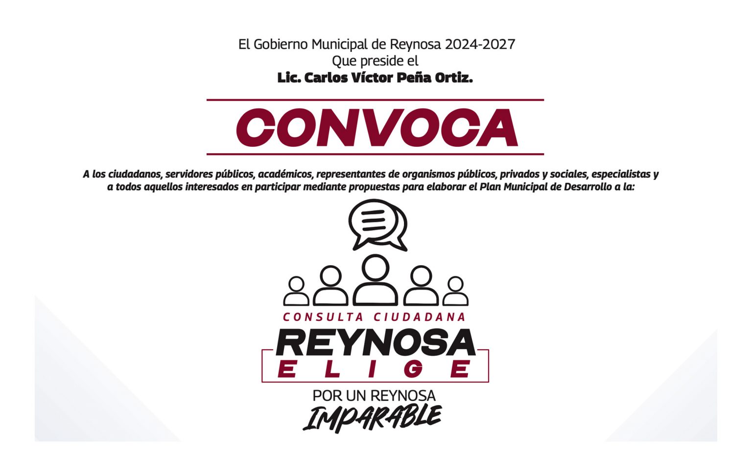 El Gobierno Municipal, encabezado por el alcalde Carlos Peña Ortiz, invita a la ciudadanía a participar en la Consulta Ciudadana “Reynosa Elige”.