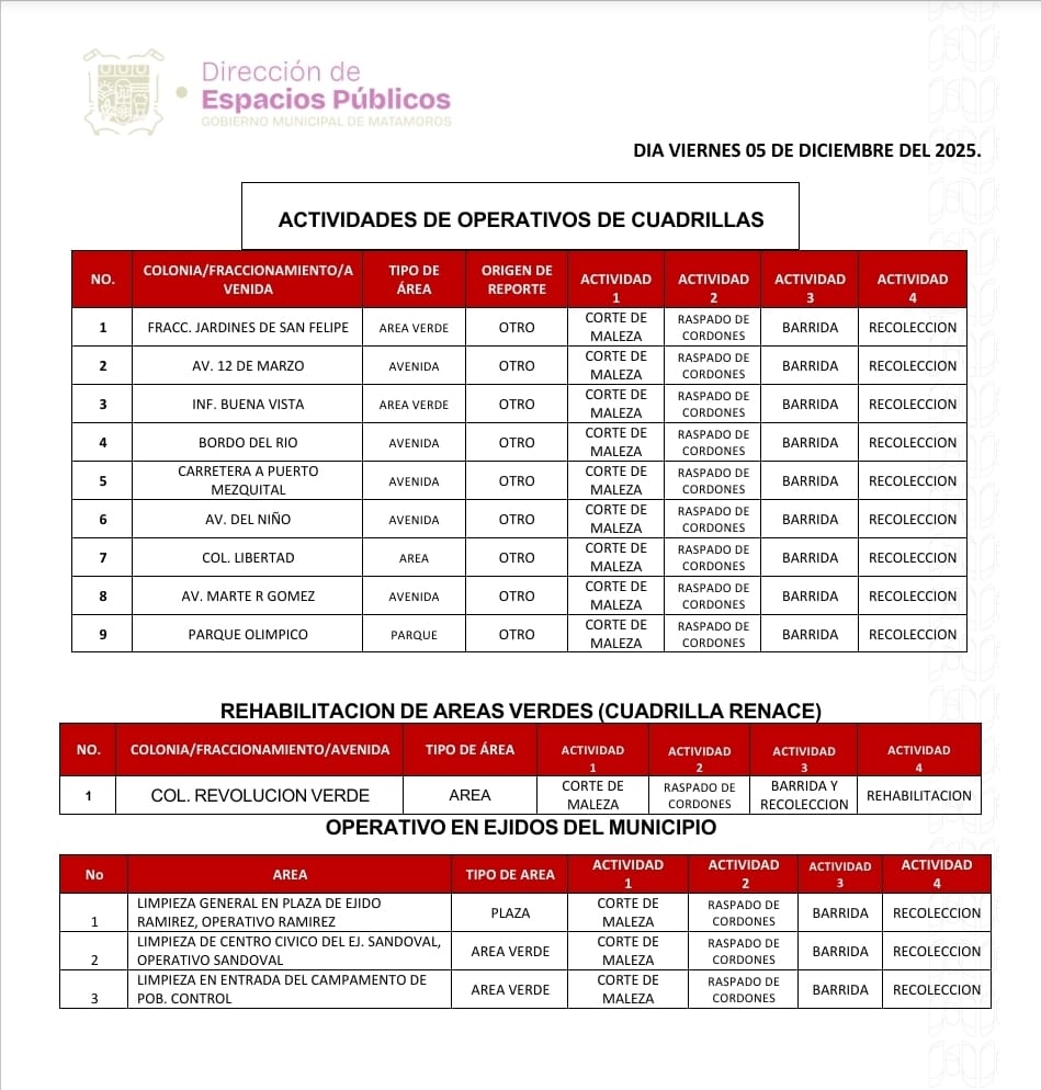 El Gobierno de Beto Granados realizará este día trabajos de limpieza en Áreas Verdes y Camellones de los siguientes lugares; por lo que te pedimos; conducir con cuidado.
