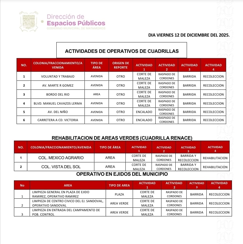 El Gobierno de Beto Granados realizará este día trabajos de limpieza en Áreas Verdes y Camellones de los siguientes lugares; por lo que te pedimos; conducir con cuidado.
