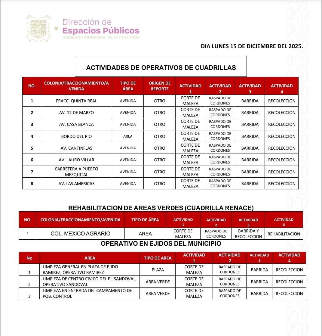 El Gobierno de Beto Granados realizará este día trabajos de limpieza en Áreas Verdes y Camellones de los siguientes lugares; por lo que te pedimos; conducir con cuidado.