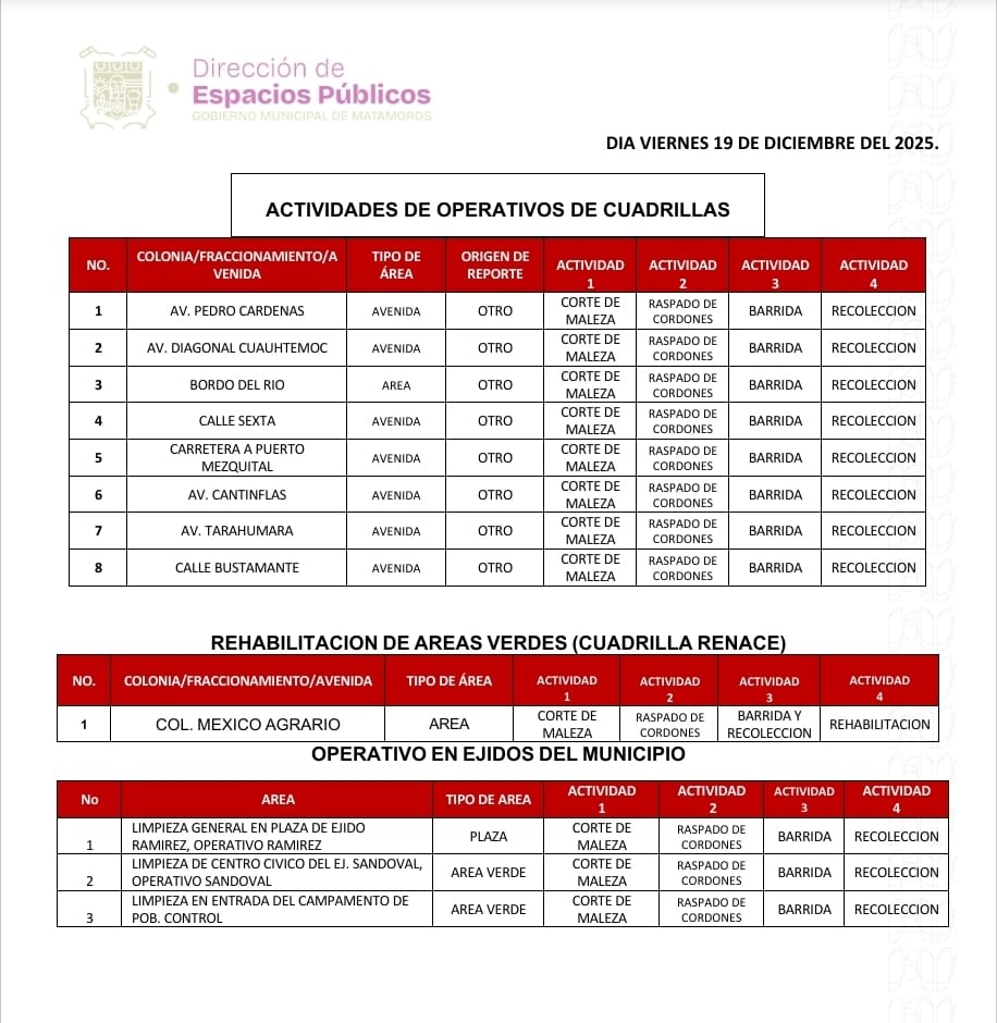 El Gobierno de Beto Granados realizará este día trabajos de limpieza en Áreas Verdes y Camellones de los siguientes lugares; por lo que te pedimos; conducir con cuidado.