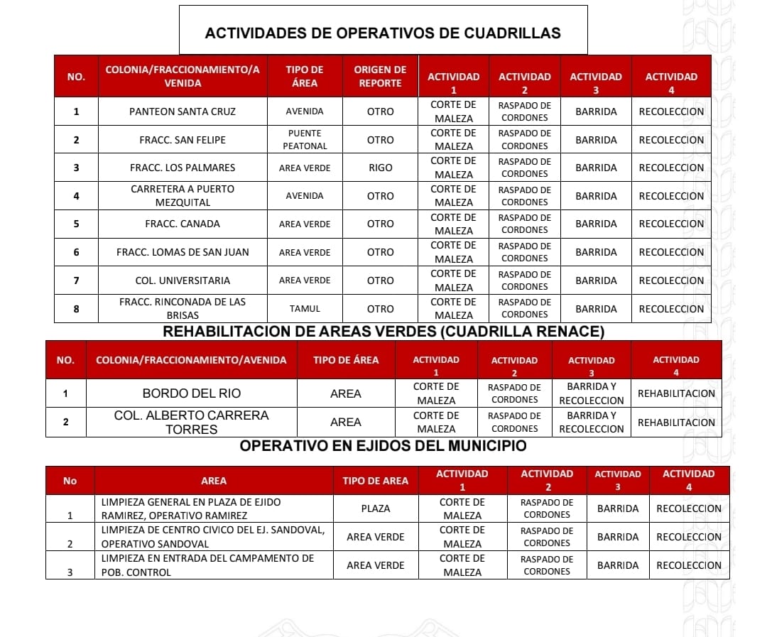 El Gobierno de Beto Granados realizará este día trabajos de limpieza en Áreas Verdes y Camellones de los siguientes lugares; por lo que te pedimos; conducir con cuidado.