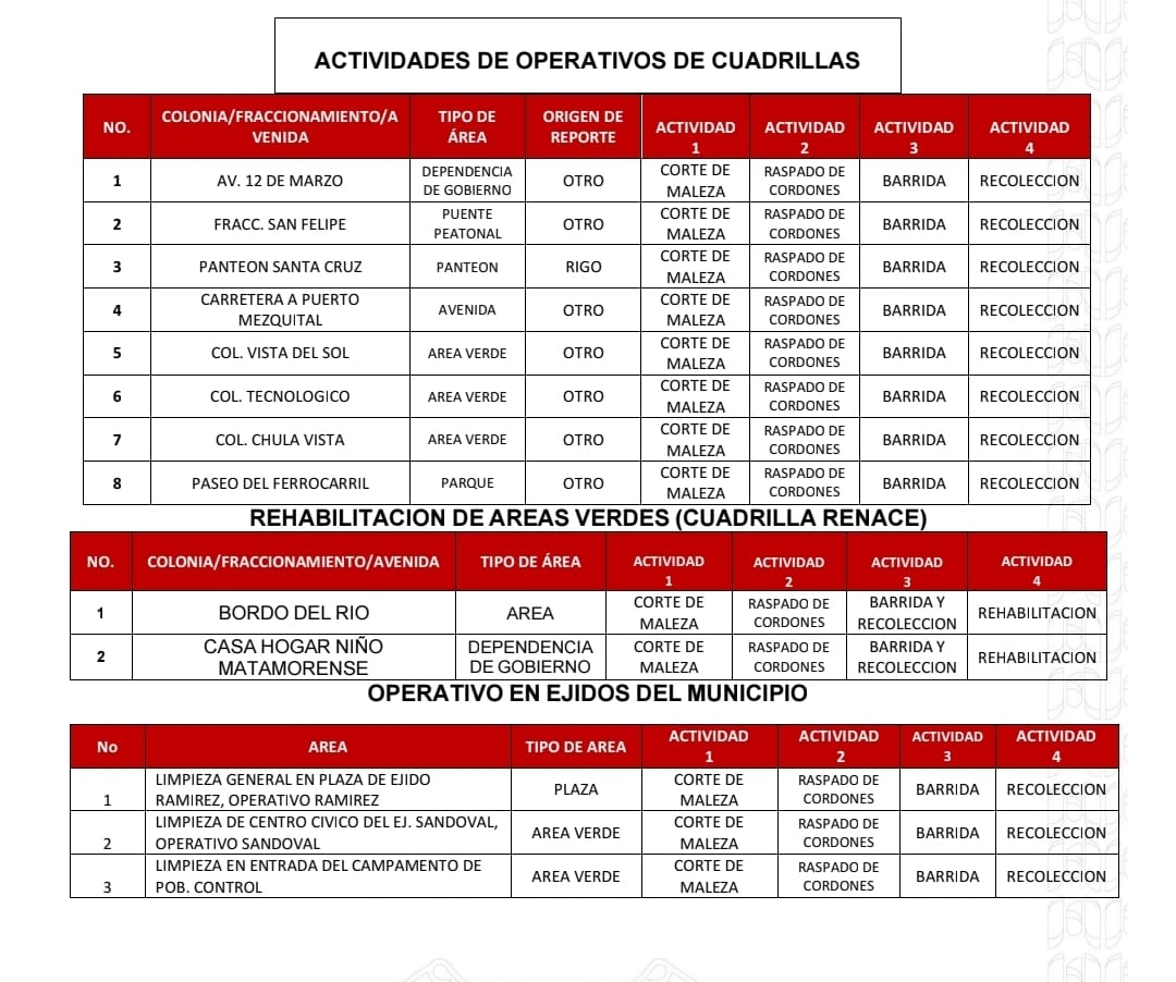 El Gobierno de Beto Granados realizará este día trabajos de limpieza en Áreas Verdes y Camellones de los siguientes lugares; por lo que te pedimos; conducir con cuidado.