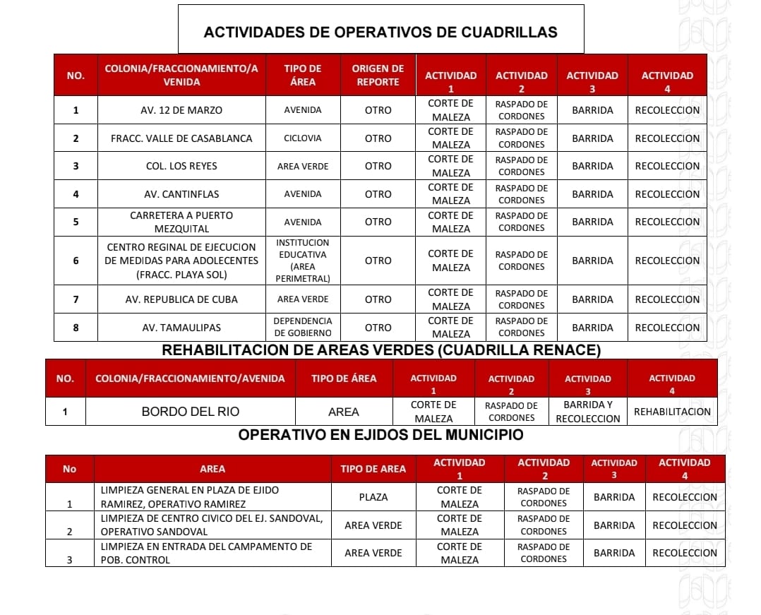 El Gobierno de Beto Granados realizará este día trabajos de limpieza en Áreas Verdes y Camellones de los siguientes lugares; por lo que te pedimos; conducir con cuidado.
