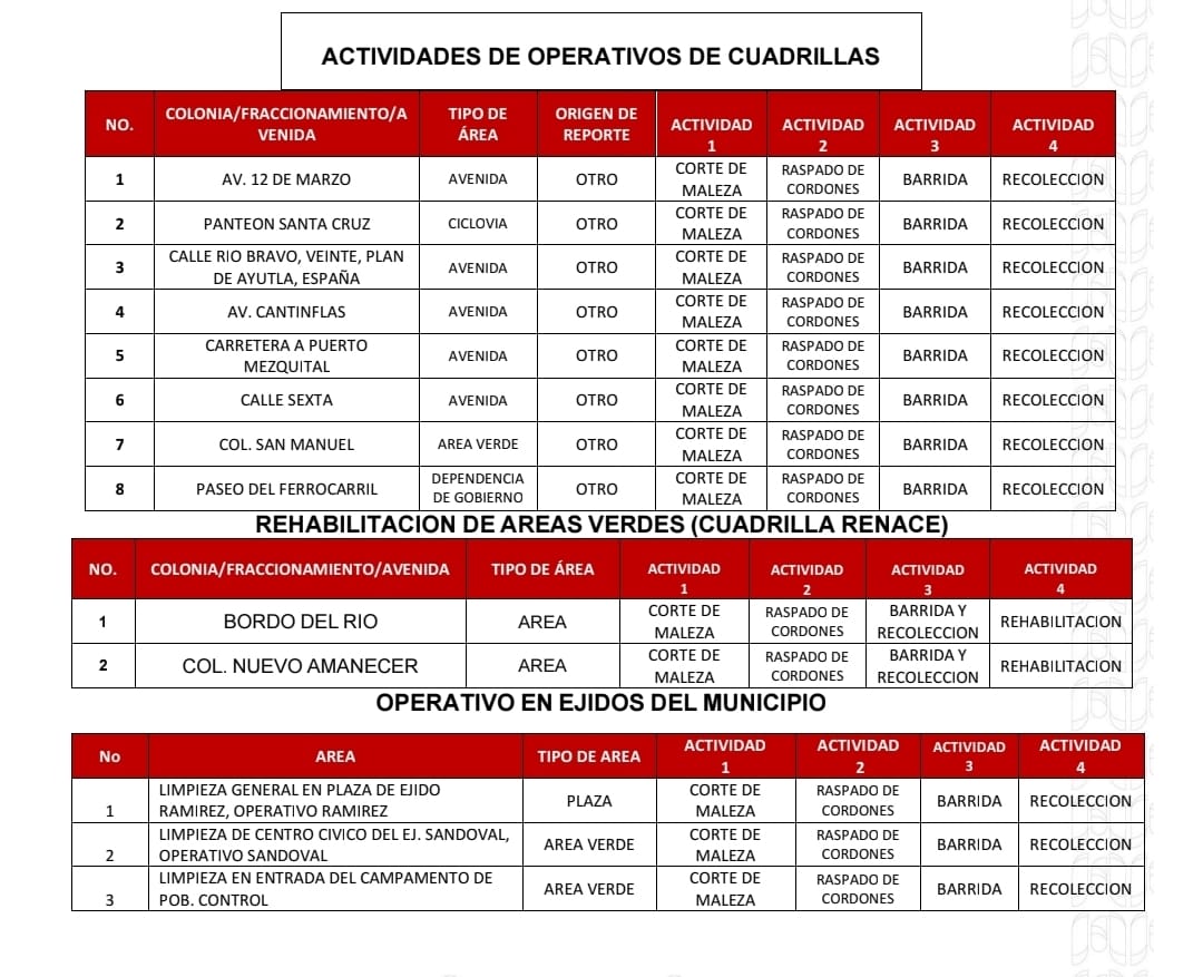 El Gobierno de Beto Granados realizará este día trabajos de limpieza en Áreas Verdes y Camellones de los siguientes lugares; por lo que te pedimos; conducir con cuidado.
