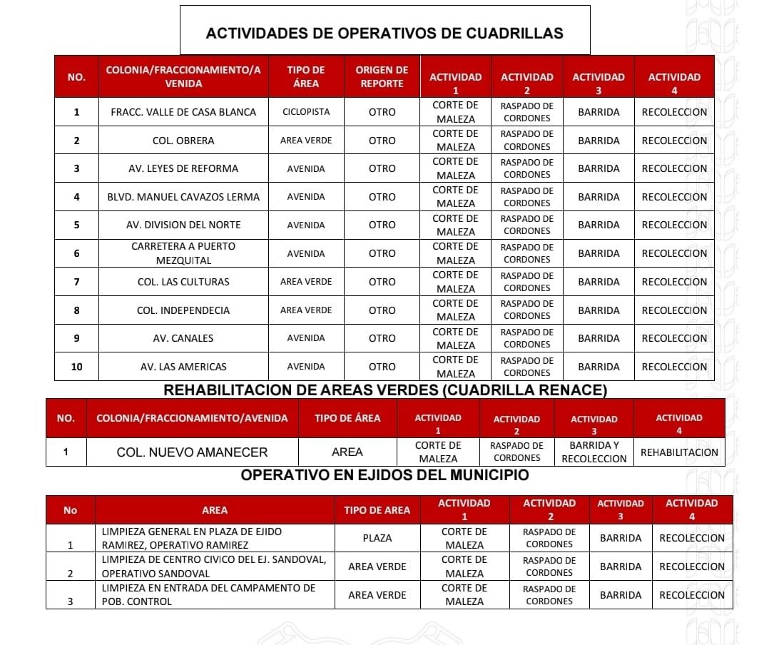 El Gobierno de Beto Granados realizará este día trabajos de limpieza en Áreas Verdes y Camellones de los siguientes lugares; por lo que te pedimos; conducir con cuidado.