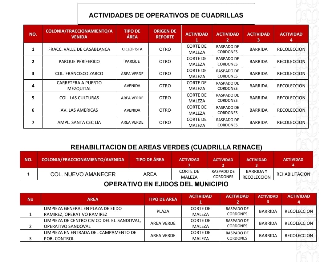 El Gobierno de Beto Granados realizará este día trabajos de limpieza en Áreas Verdes y Camellones de los siguientes lugares; por lo que te pedimos; conducir con cuidado.