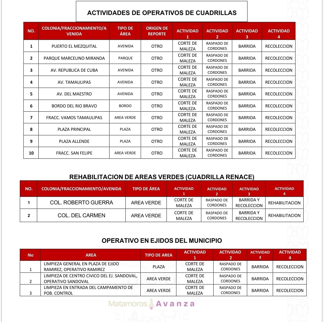 El Gobierno de Beto Granados realizará este día trabajos de limpieza en Áreas Verdes y Camellones de los siguientes lugares; por lo que te pedimos; conducir con cuidado.