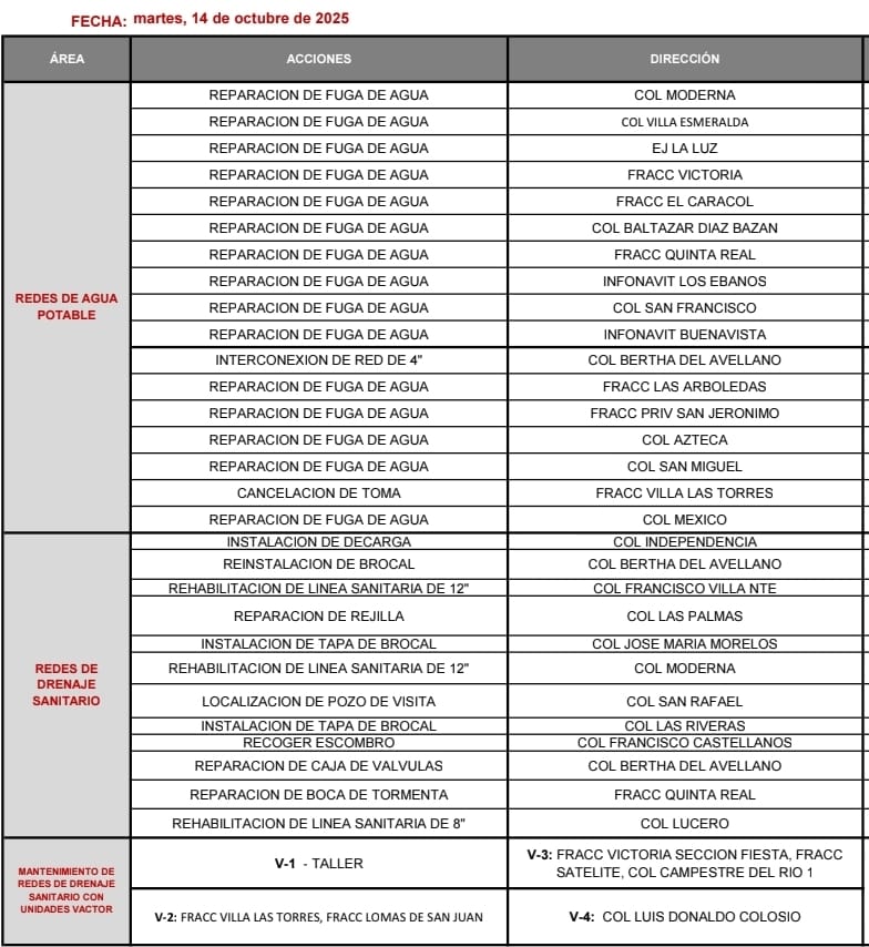 Agenda de reparaciones de fugas de Agua Potable y mantenimiento del Drenaje Sanitario en Matamoros 15 octubre, 202514 octubre, 2025 por Alicia Rodriguez El Gobierno de Beto Granados estará trabajando en los siguientes puntos de la ciudad para dar solución a los problemas que por años fueron ignorados. Si detectas aguas negras o fugas en tu colonia; haz tu reporte al 868 150 2000.