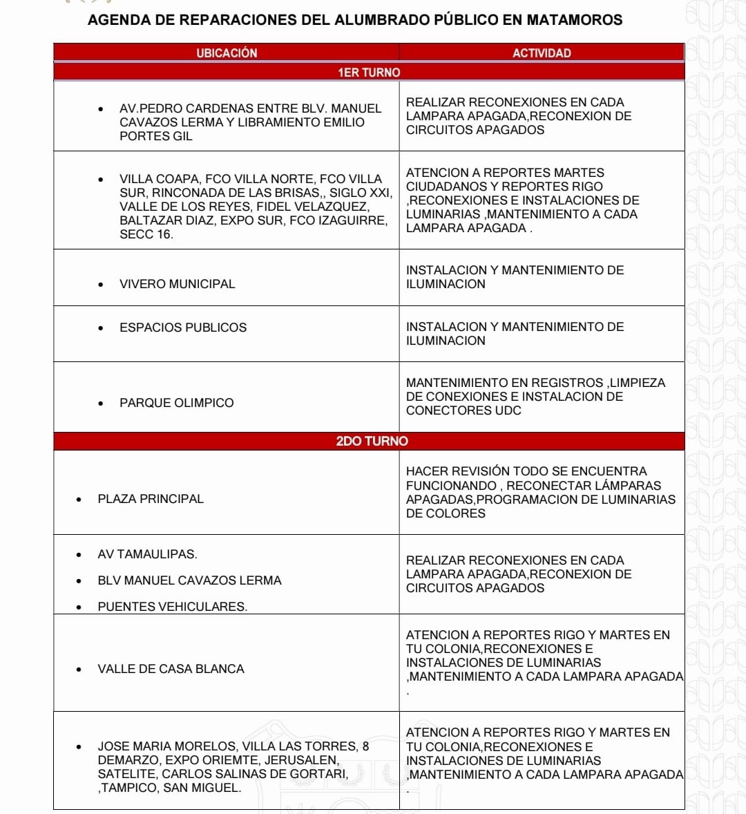 Agenda de Reparaciones del Alumbrado Público de Matamoros