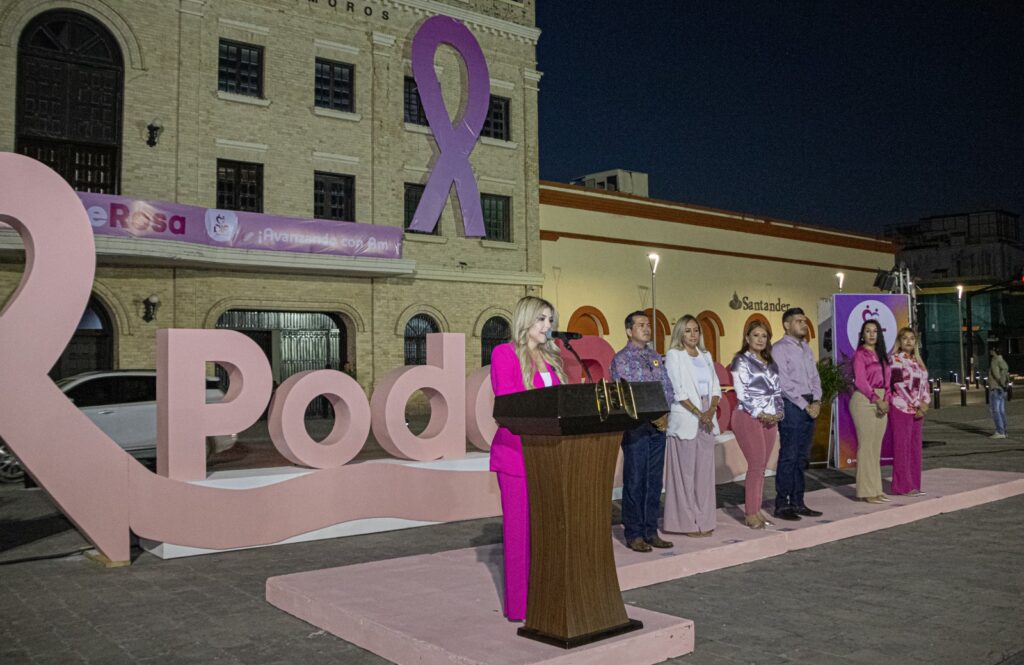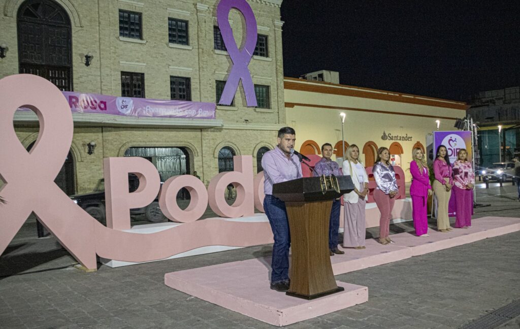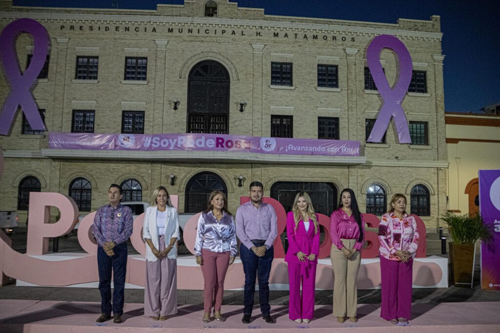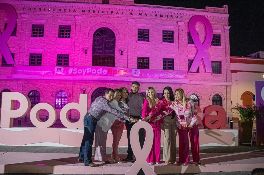 Matamoros, Tamaulipas – La noche de este martes, la fachada de la Presidencia Municipal de Matamoros se vistió de rosa en un emotivo acto de conmemoración por la lucha contra el cáncer de mama. El alcalde Alberto Granados, acompañado por la presidenta del Sistema DIF Matamoros, Anabeth Ariceaga de Granados, encabezó el evento “Iluminación #SoyPodeRosa”, cuyo objetivo es sensibilizar a la población sobre la importancia de la prevención y detección temprana de esta enfermedad.