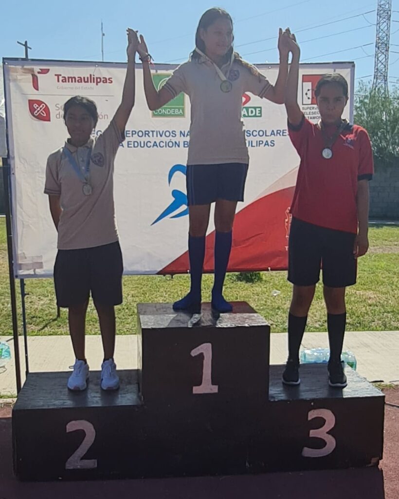La maestra Samanta Marial Guerra Chávez, directora de la Telesecundaria “Agapito González Cavazos”, dijo que sus alumnos ganadores son: David Díaz Ríos como primer lugar en salto de longitud y Angel Eduardo Garza Jaramillo como primer lugar en relevos de cuatro por cien.
