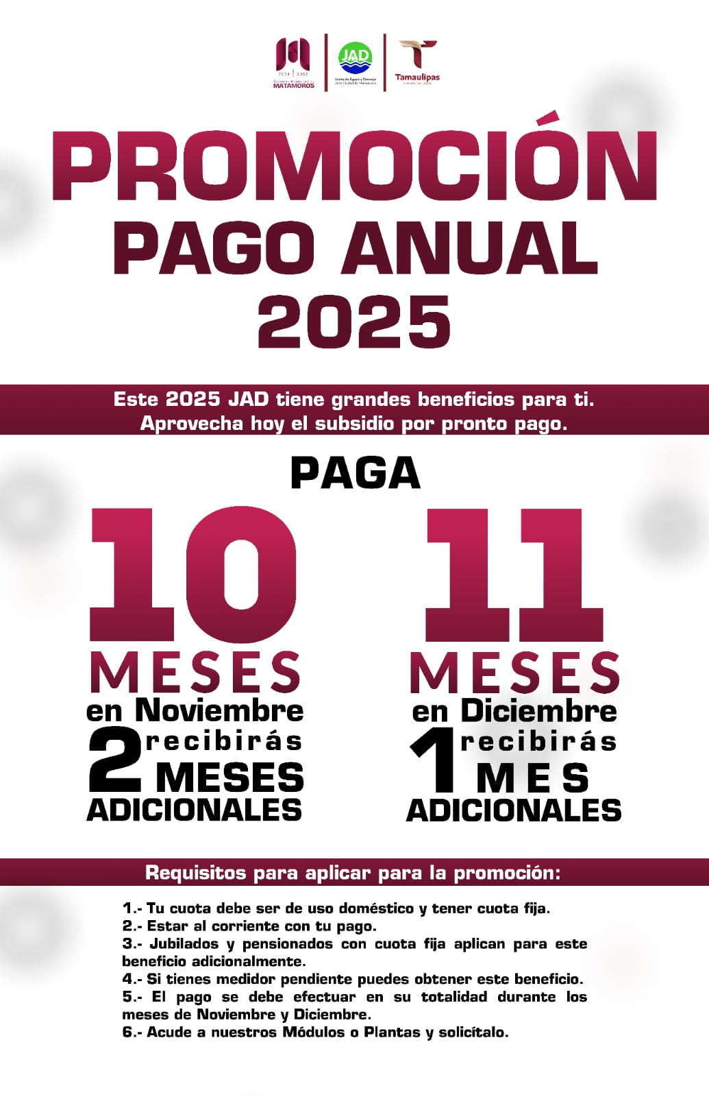 El gobierno municipal de Matamoros y la Junta de Aguas y Drenaje (JAD) anuncian una atractiva promoción de pago anual para todos sus usuarios de servicio doméstico. Aquellos que realicen su pago en el mes de noviembre recibirán dos meses adicionales de servicio, mientras los usuarios que lo hagan en diciembre obtendrán un mes adicional.