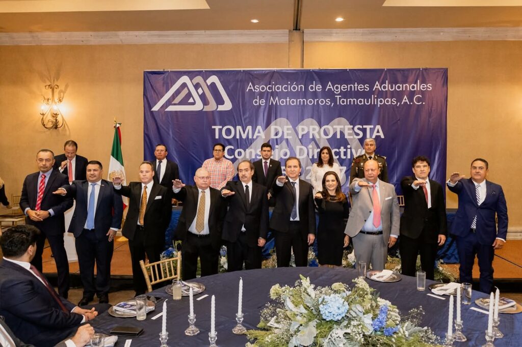 H. Matamoros, Tamaulipas.- El presidente municipal de Matamoros, Beto Granados, asistió a la Toma de Protesta del Consejo Directivo 2025-2027 de la Asociación de Agentes Aduanales de Matamoros, Tamaulipas A.C., evento que reunió a distinguidas personalidades de los ámbitos militar, gubernamental y aduanero.