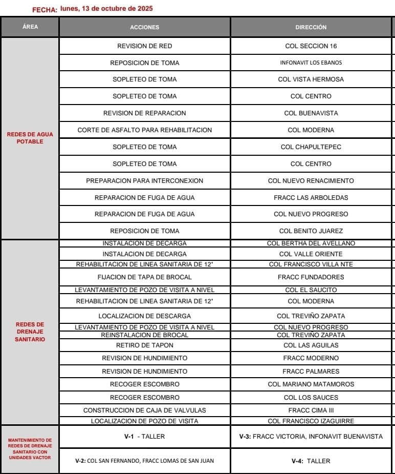 Agenda de reparaciones de fugas de Agua Potable y mantenimiento del Drenaje Sanitario en Matamoros