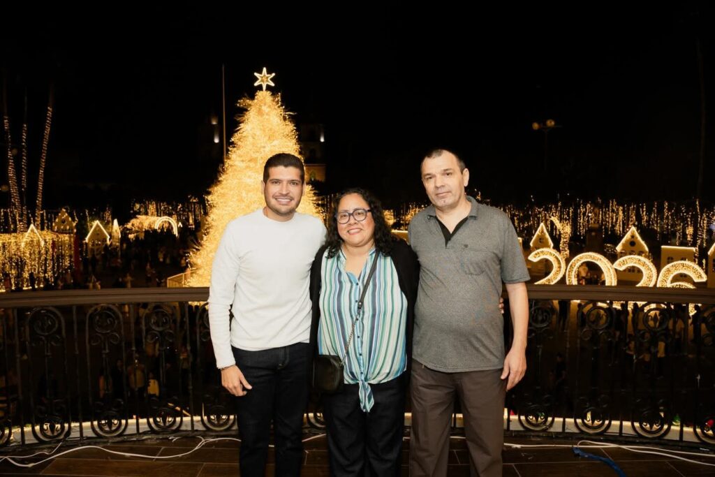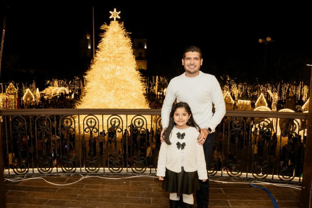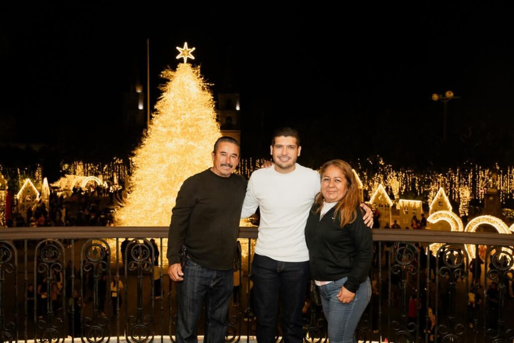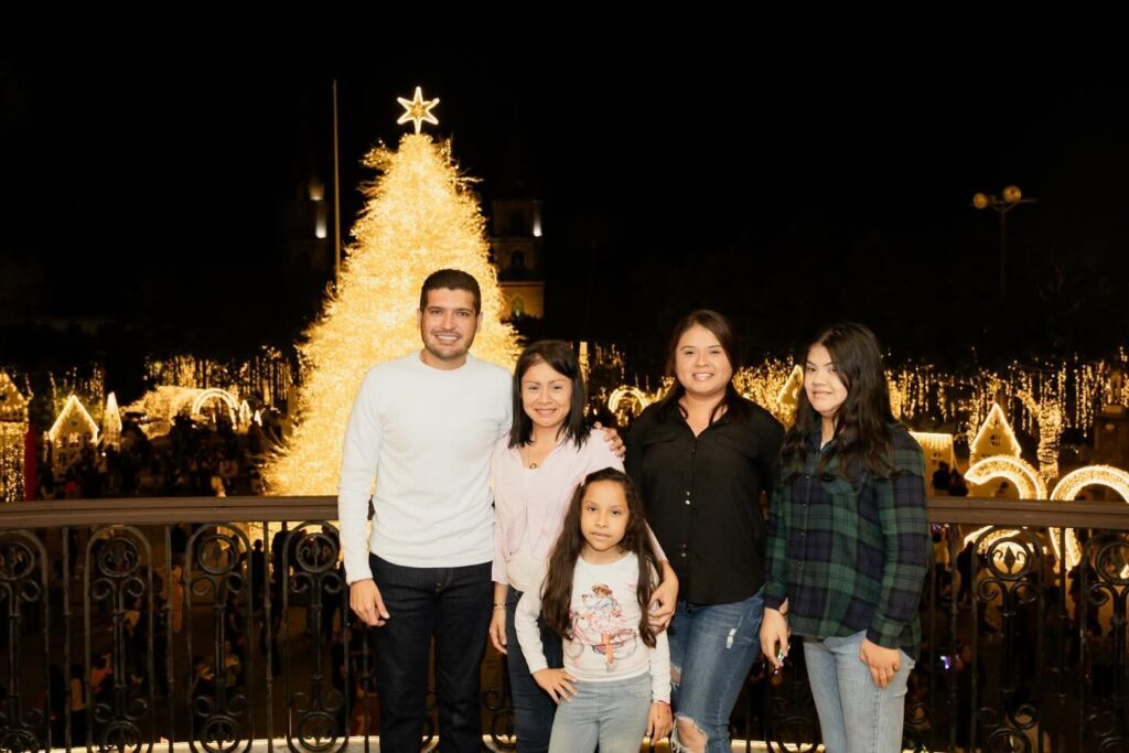 H. Matamoros, Tamaulipas.- Con la presencia del alcalde Beto Granados, residentes de Matamoros tuvieron la oportunidad de subir al balcón de la Presidencia Municipal para tomarse su foto en familia, con el pino iluminado y la Plaza Principal como el marco perfecto que hace brillar a Matamoros.