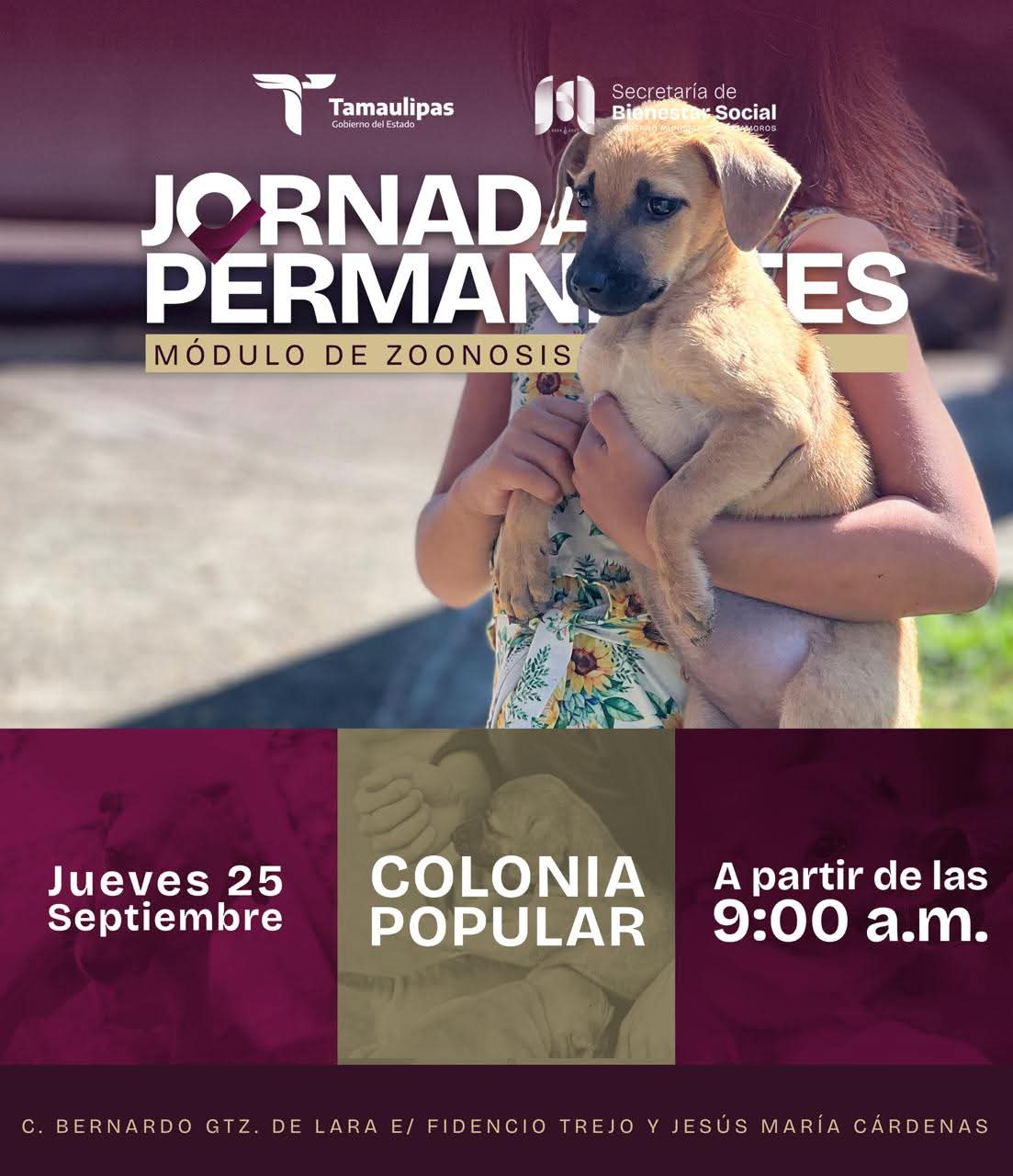 H. Matamoros, Tamaulipas.- El alcalde Beto Granados invita a las familias de la Colonia Popular a participar este jueves 25 de septiembre, a partir de las 9:00 de la mañana en la jornada que realizará el Módulo de Zoonosis, ofreciendo atención y asesoría para el bienestar de perros y gatos.