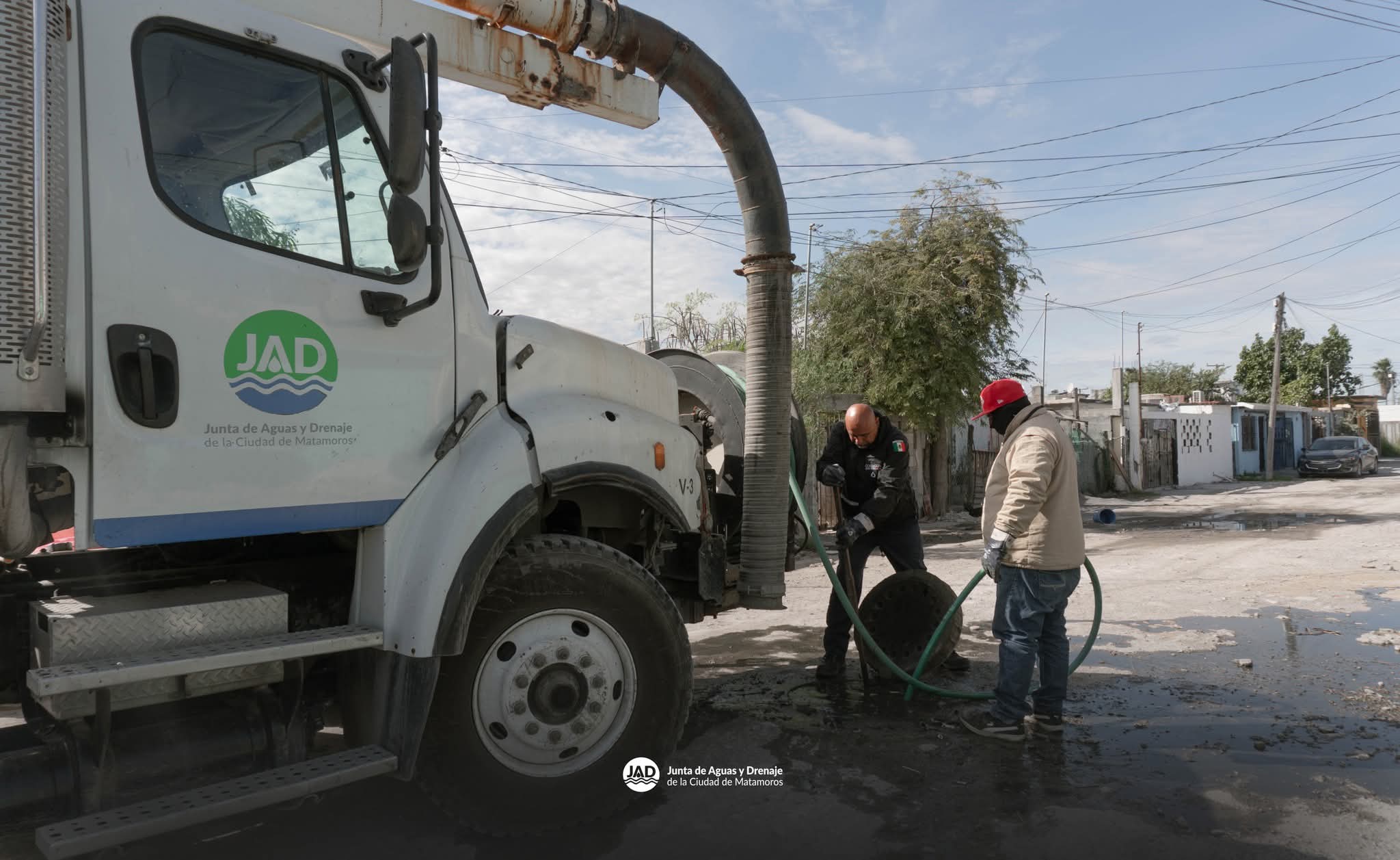 H. Matamoros, Tamaulipas.- Por instrucciones del alcalde de Matamoros, Beto Granados, personal del área de vactor de la Junta de Aguas y Drenajes acudió a diversos sectores de la ciudad para llevar a cabo trabajos de limpieza y desazolve en la red de drenaje, como parte de las acciones permanentes para mejorar el funcionamiento del sistema sanitario y prevenir taponamientos.