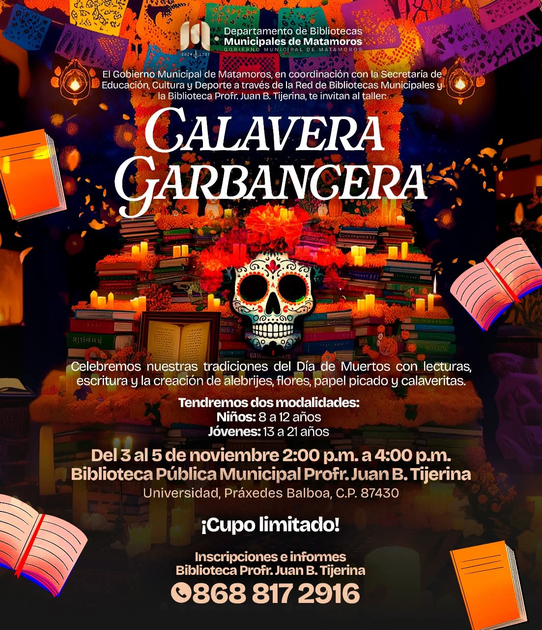 H. Matamoros, Tamaulipas.- El Gobierno Municipal, encabezado por el alcalde Beto Granados, invita a niñas, niños y jóvenes al taller “Calavera Garbancera”, donde podrán disfrutar de actividades llenas de color, lectura y creatividad. Durante tres días, los participantes elaborarán alebrijes, flores de papel, papel picado y calaveritas, fomentando el amor por nuestras tradiciones mexicanas. Será … Leer más