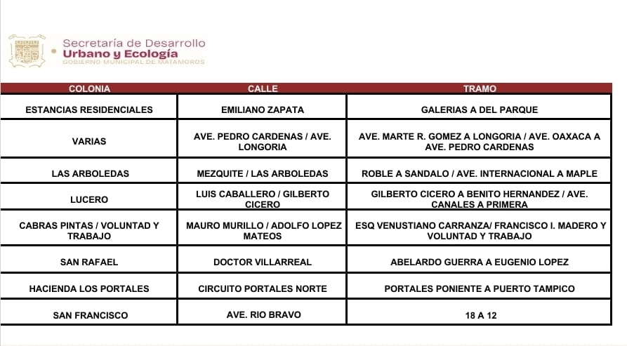 El Gobierno de Matamoros te invita a circular con precaución y paciencia si transitas por las siguientes avenidas: -Calle Sexta9:00 a.m. a 11:00 a.m. Inicio/Término: Blvd. Manuel Cavazos Lerma Término/Inicio: Calle Ignacio Zaragoza -Av. Pedro Cárdenas1:00 p.m. a 3:00 p.m. Inicio: Blvd. Manuel Cavazos Lerma Término: Lib. Emilio Portes Gil -Av. Pedro Cárdenas3:00 p.m. a … Leer más