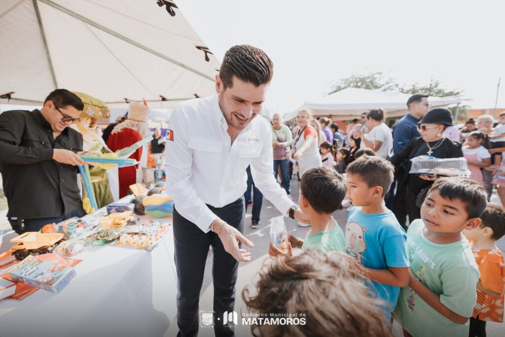 H. Matamoros, Tamaulipas.- La Plaza del fraccionamiento Villa Las Torres se convirtió en un espacio de alegría y unión familiar con la entrega de juguetes encabezada por el alcalde Beto Granados, en compañía de la presidenta del Sistema DIF Matamoros, Anita Ariceaga de Granados. Niñas y niños vivieron un momento lleno de ilusión, en una jornada pensada para celebrar la infancia y fortalecer los lazos comunitarios.