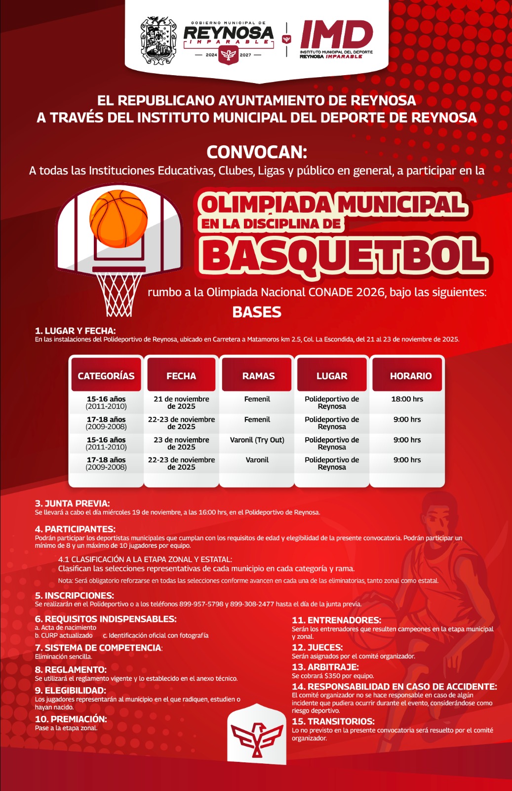 El Alcalde Carlos Peña Ortiz hace una cordial invitación a instituciones educativas, clubes deportivos, ligas y al público en general a participar en la Olimpiada Municipal de Basquetbol, rumbo a las Olimpiadas Nacionales CONADE 2026, organizada a través del Instituto Municipal del Deporte de Reynosa.