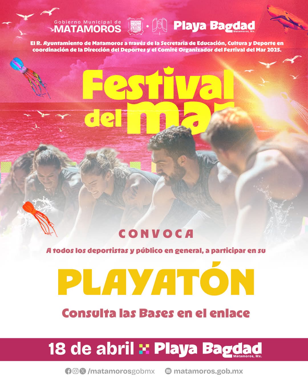 H. Matamoros, Tamaulipas.- El Gobierno Municipal de Matamoros, encabezado por el Presidente Municipal Alberto Granados Fávila, invita a la ciudadanía a participar en el Playatón Deportivo 2025, un evento que combinará el deporte, como parte de las actividades del Festival del Mar 2025.