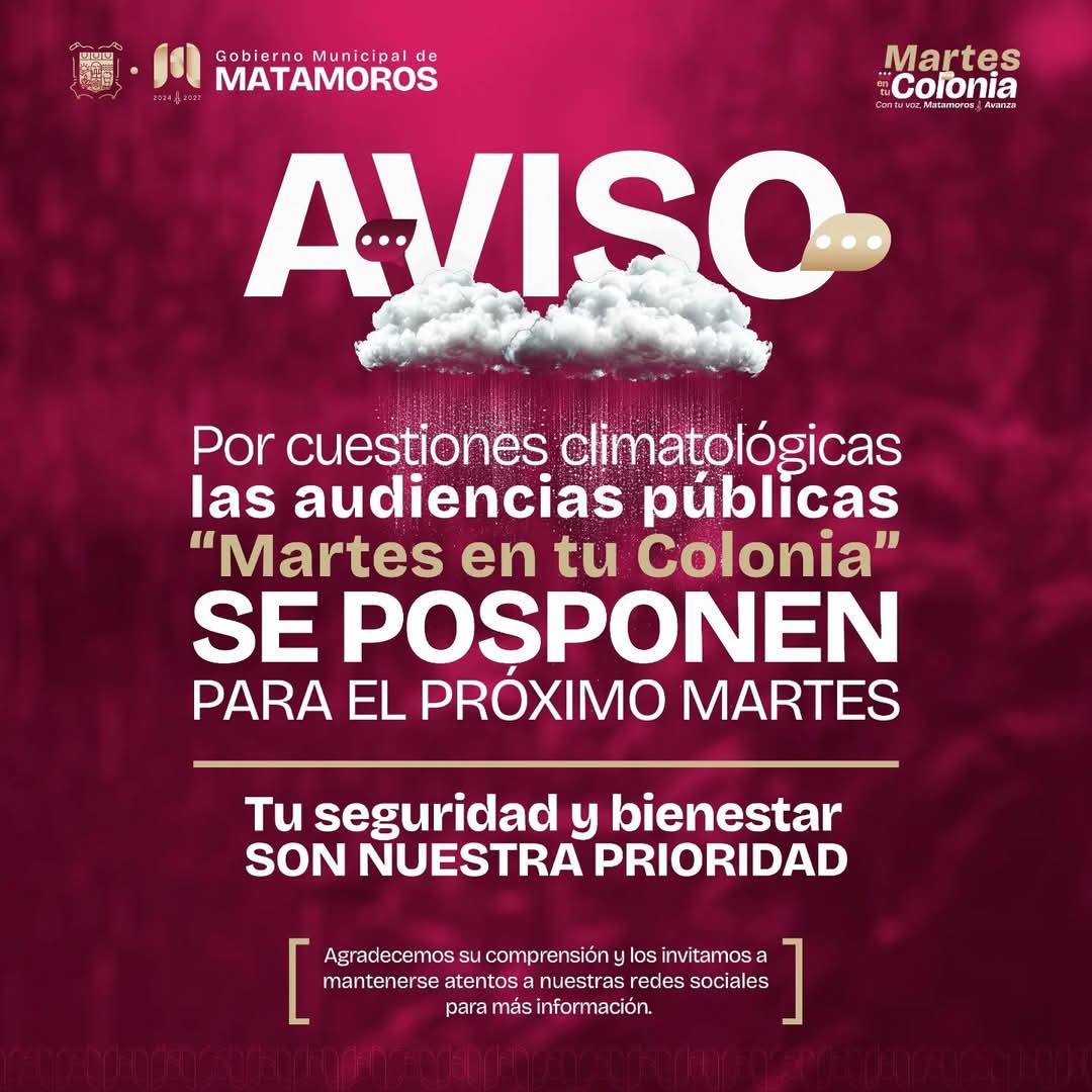 Debido a las condiciones climatológicas y para brindar una mejor atención a la ciudadanía matamorense, el programa Martes en tu Colonia se propondrá para la próxima semana. 6 enero, 20253 diciembre, 2024 por Alicia Rodriguez