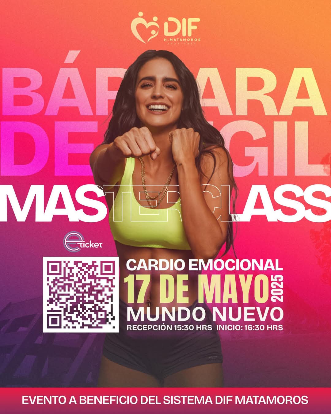 H. Matamoros, Tamaulipas.- El Sistema para el Desarrollo Integral de la Familia (DIF) Matamoros, en su compromiso por impulsar acciones que promuevan el bienestar físico, mental y emocional de la ciudadanía, invita cordialmente a la comunidad a participar en la próxima Master Class “Cardio Emocional”, que será impartida por la reconocida actriz e influencer mexicana Bárbara de Regil.