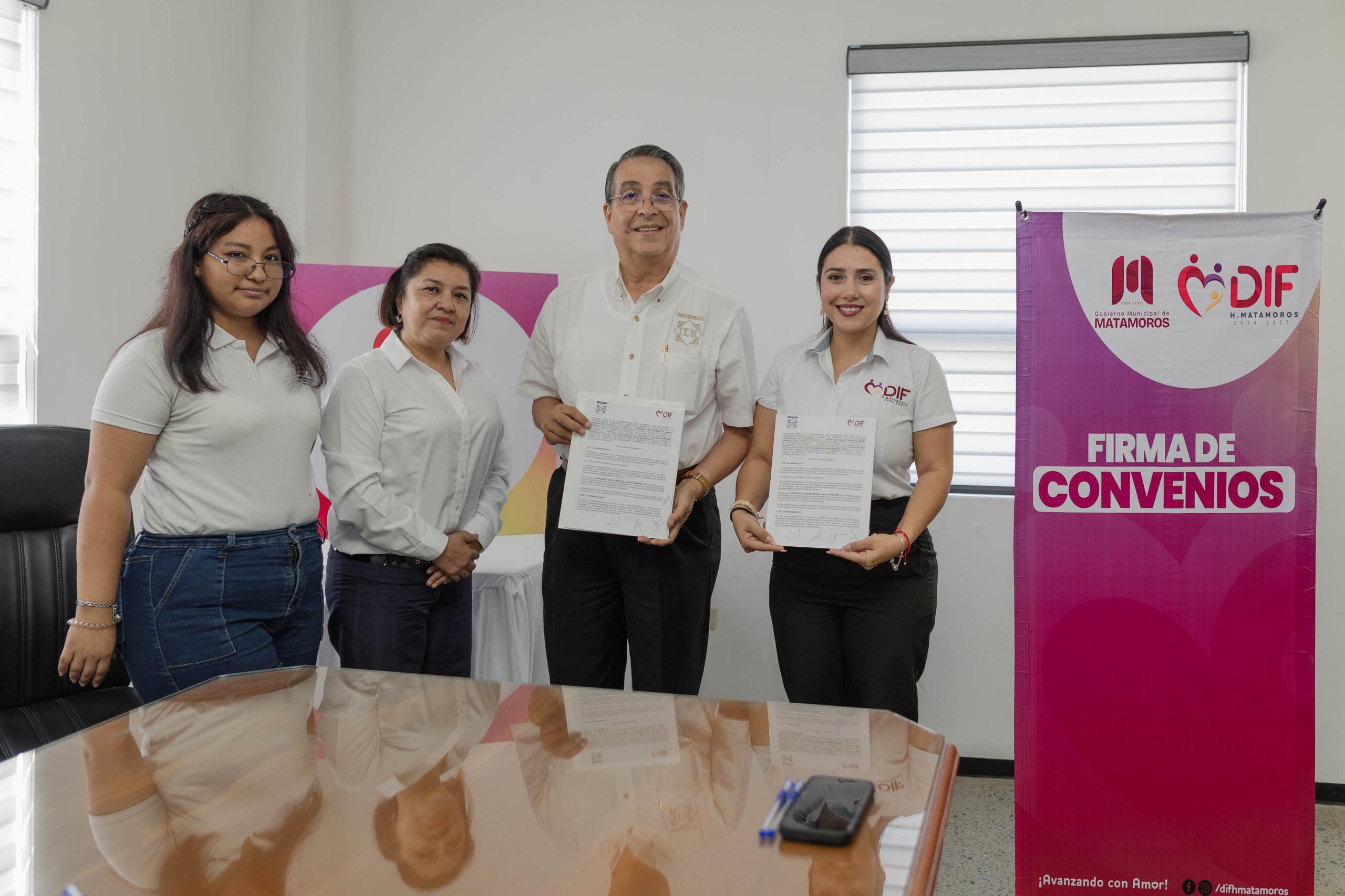Trabajando a favor de la preparación profesional de las y los jóvenes, el Sistema DIF Matamoros que preside la Lic. Ana Ariceaga de Granados, llevó a cabo este vieneres la firma de convenio con la Universidad Nuevo Santander y la Universidad de Ingenierías y Ciencias del Noreste (ICN), lo que permitirá a los estudiantes de estas intituciones realizar su servicio social y prácticas profesionales en los diferentes centros y áreas de este organismo.