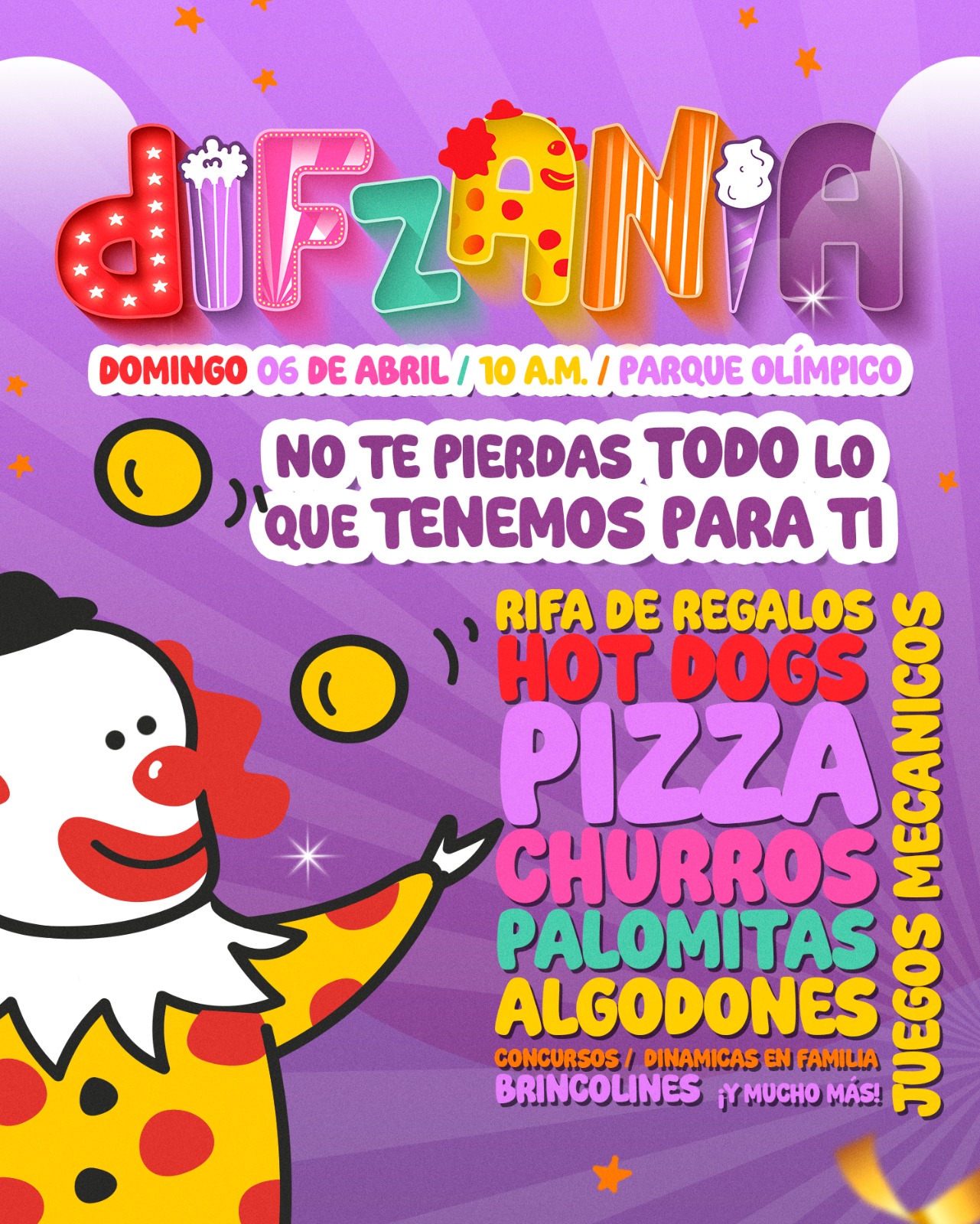 Esta actividad con la temática de circo, dará inicio a partir de las 10:00 de la mañana en el Parque Olímpico, en donde las familias podrán disfrutar de rifa de regalos, concursos, dinámicas en familia, área de brincolines, juegos mecánicos, así como hot dogs, pizza, churros, palomitas, algodones y muchas sorpresas más.