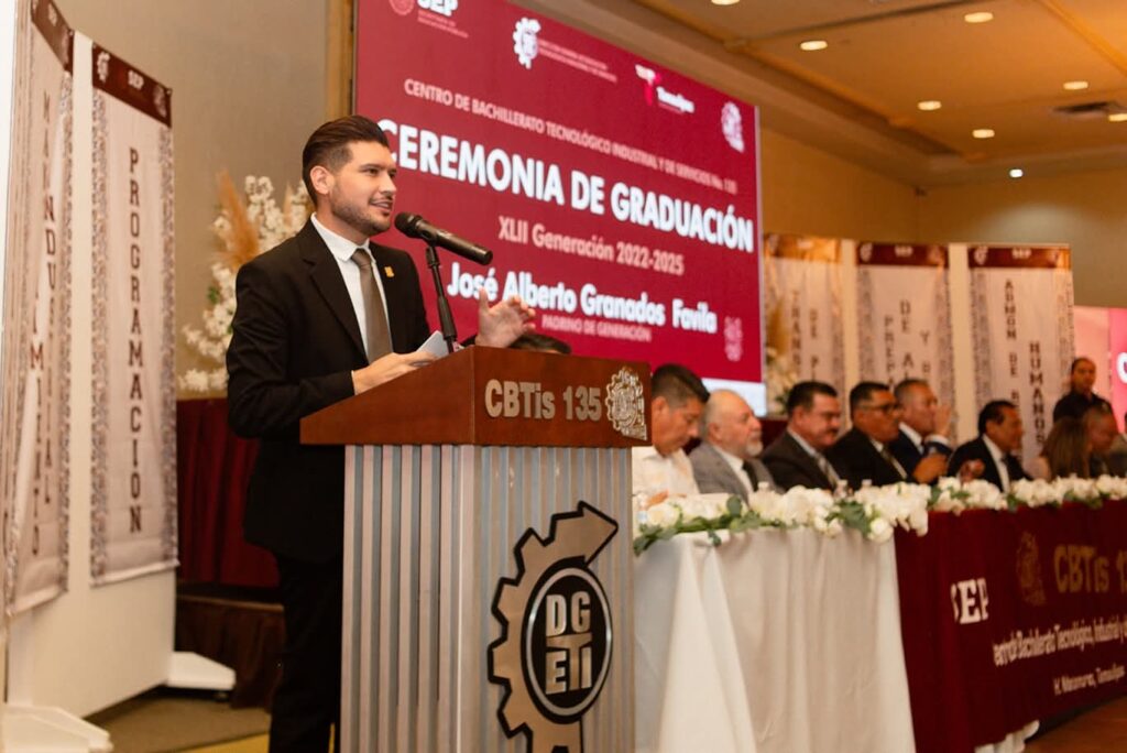 En el evento del turno vespertino, reiteró su orgullo por ser padrino de generación y reconoció el esfuerzo de los jóvenes. “Este logro es fruto de su esfuerzo, dedicación y constancia. Les deseo todo el éxito en la nueva etapa que está por comenzar. ¡Sigan soñando en grande!”, expresó.
