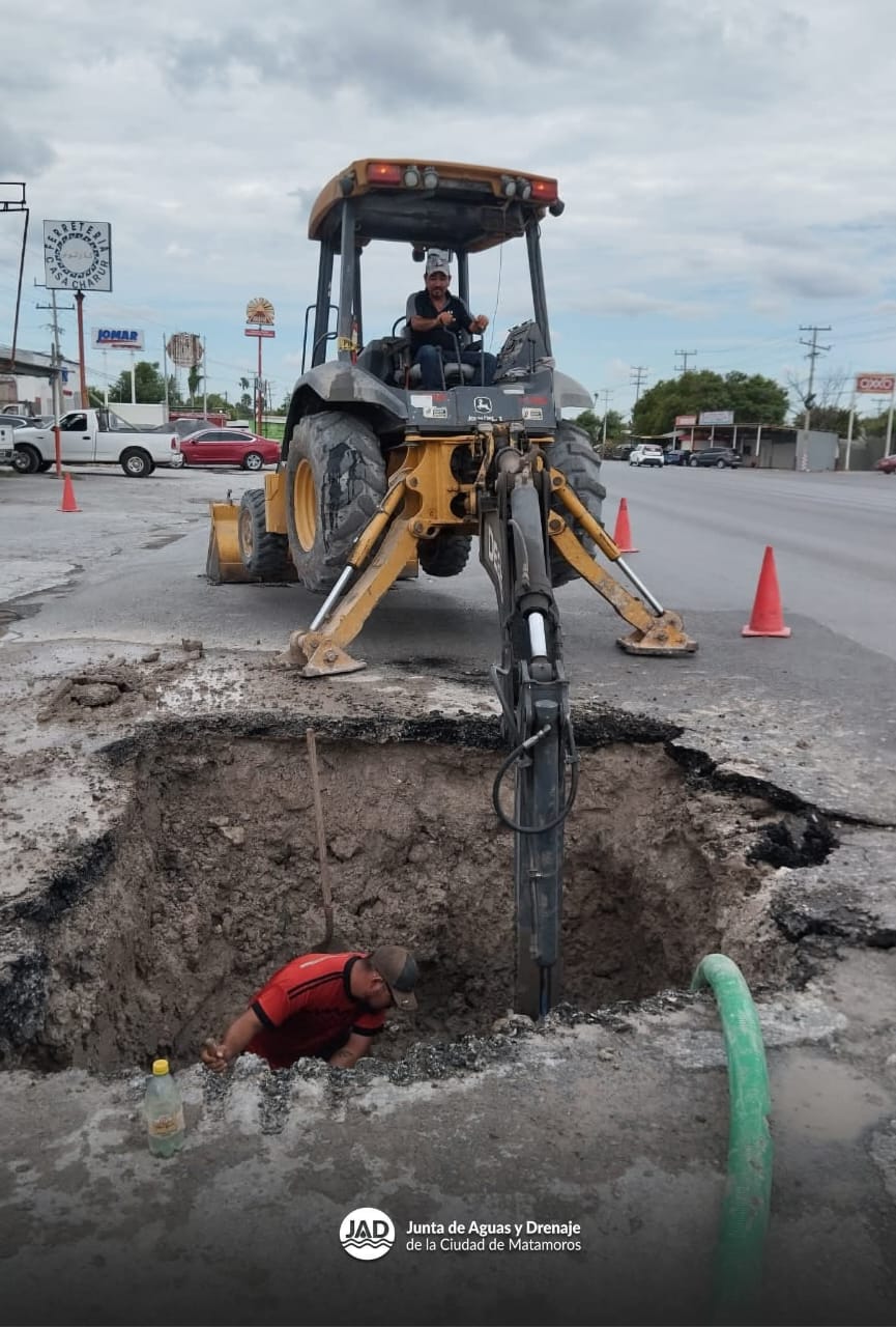 H. Matamoros, Tamaulipas.- El Gobierno del alcalde Beto Granados, a través de la Junta de Aguas y Drenaje, atendió de manera inmediata la reparación de una fuga de agua en el cruce de la Avenida Sendero Nacional y la calle Colima.