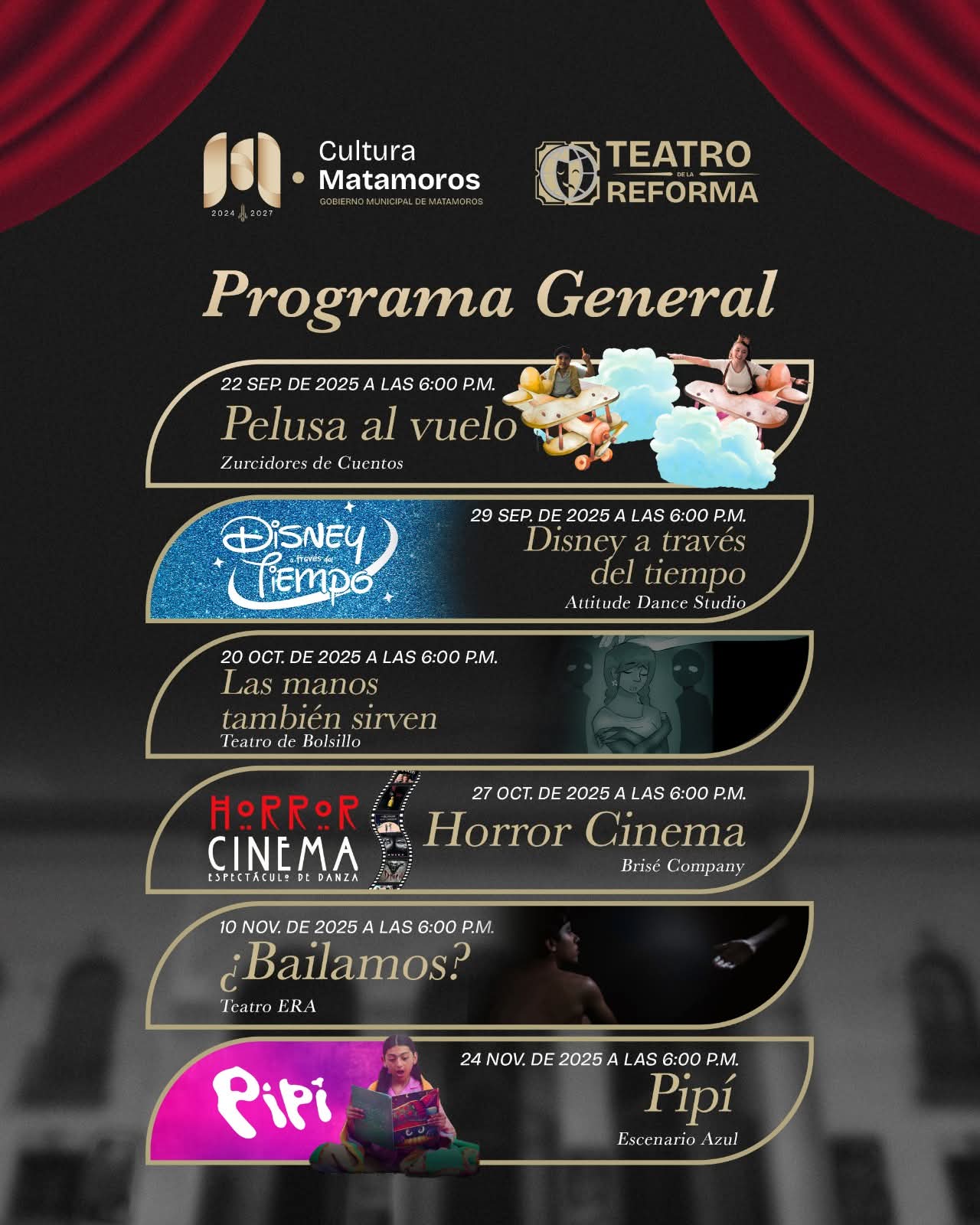 Matamoros, Tam.- El Gobierno de Beto Granados informó que, cada lunes, el escenario del Teatro de la Reforma cobra vida con historias que emocionan, inspiran y acercan a la comunidad al arte a través del programa “Lunes al Teatro”, el cual se llevará a cabo de septiembre a noviembre.