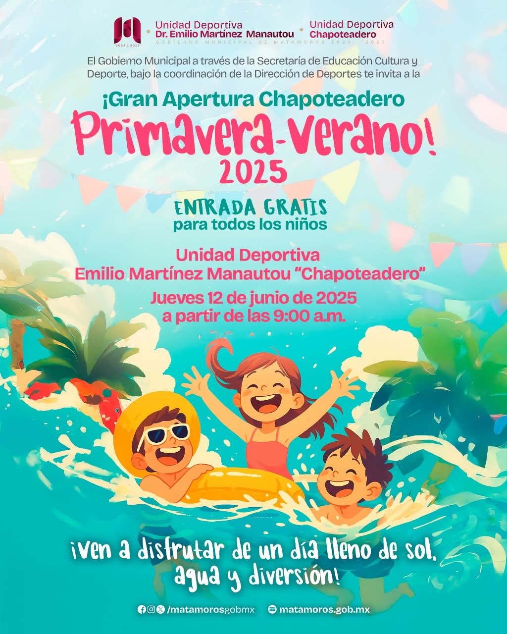H. Matamoros, Tamaulipas.- El Gobierno Municipal, que encabeza el alcalde Beto Granados, invitó, a través de la Unidad Deportiva “Emilio Martínez Manautou”, a todas las niñas y niños, junto con sus familias, a participar en la gran apertura del Chapoteadero Primavera-Verano 2025, un espacio recreativo especialmente acondicionado para brindar momentos de alegría, sana convivencia y diversión acuática a los más pequeños.