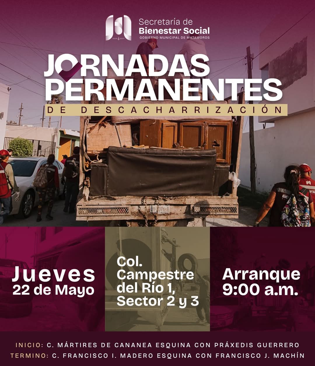H. Matamoros, Tamaulipas.- El Gobierno Municipal de Matamoros, encabezado por el alcalde Beto Granados, continúa trabajando de manera comprometida por la salud y el bienestar de sus ciudadanos. Este jueves 22 de mayo, las Jornadas Permanentes de Descacharrización llegarán a la colonia Campestre del Río 1, específicamente en los sectores 2 y 3, como parte de una estrategia integral de prevención de enfermedades.