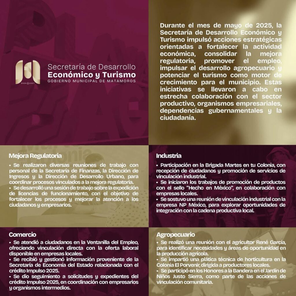 H. Matamoros, Tamaulipas.- Durante el mes de mayo, el gobierno municipal de Matamoros, a través de la Secretaría de Desarrollo Económico y Turismo, puso en marcha una serie de acciones estratégicas que fortalecen la economía local, promueven el empleo y consolidan al municipio como una ciudad con visión de crecimiento. Estas iniciativas responden al compromiso de la Cuarta Transformación de generar bienestar desde lo local, con un enfoque sustentable y de inclusión.