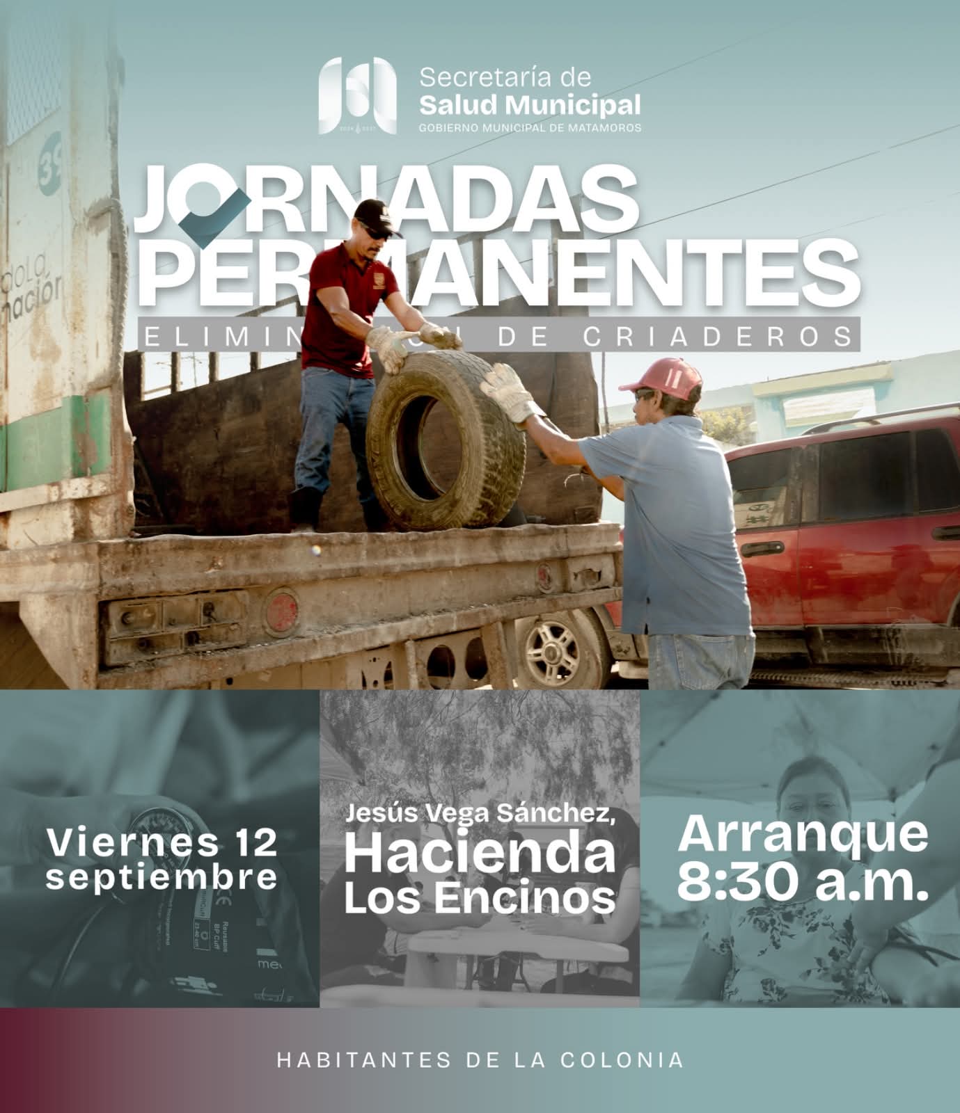 H. Matamoros, Tamaulipas.- Este viernes, a partir de las 8:30 de la mañana, las jornadas permanentes de eliminación de criaderos que realiza el gobierno municipal a través de la Secretaría de bienestar social, visitarán las colonias Jesús Vega Sánchez y Hacienda Los Encinos.