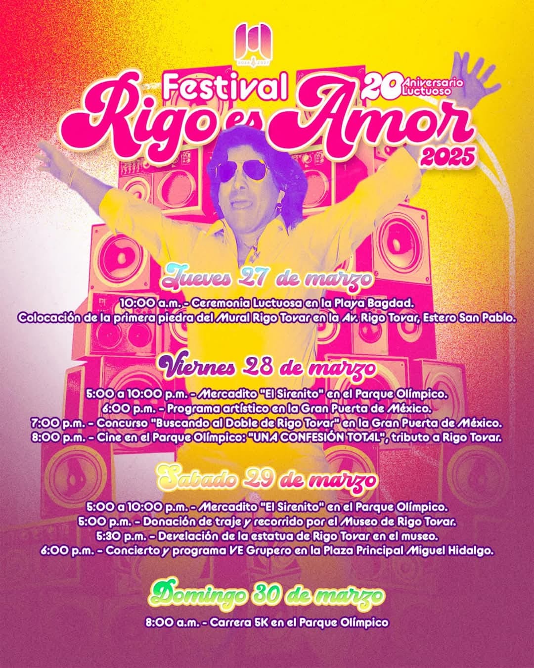 “Invitamos a toda la ciudadanía a sumarse a esta gran celebración en honor a Rigo Tovar, un artista que puso el nombre de Matamoros en alto. ¡Te esperamos! Rigo es amor”, expresó el alcalde.