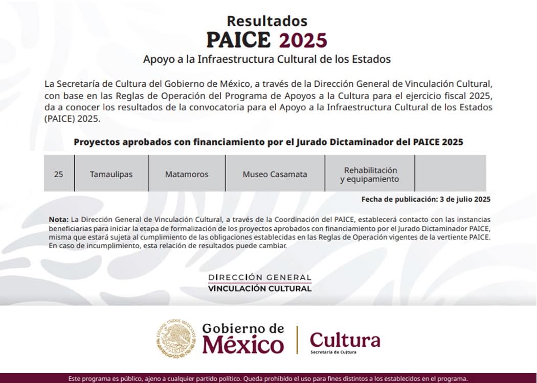 H. Matamoros, Tamaulipas.- El Gobierno de Matamoros, que preside Beto Granados, informó con orgullo que el Museo Casamata ha sido seleccionado dentro del Programa de Apoyo a la Infraestructura Cultural de los Estados (PAICE) 2025, impulsado por la Secretaría de Cultura del Gobierno de México. Esta selección representa un paso fundamental para seguir preservando uno de los espacios más emblemáticos de la ciudad.