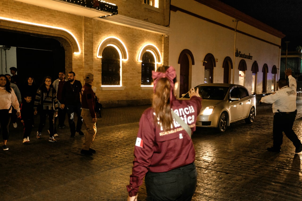 H. Matamoros; Tamaulipas.- Por iniciativa del alcalde Beto Granados, este domingo se mantiene un operativo especial de seguridad turística en la Plaza Principal, donde agentes brindan apoyo permanente a las familias que acuden a tomarse la fotografía en el balcón de la Presidencia Municipal y a disfrutar del ambiente navideño.