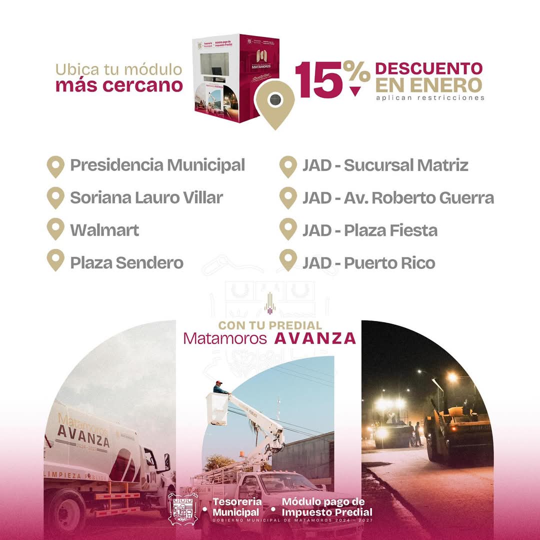 Este enero, aprovecha el 15% de descuento en tu pago si estás al corriente. Visita el módulo más cercano: tenemos ubicaciones en Presidencia Municipal, plazas comerciales y oficinas de la Junta de Aguas y Drenaje de la ciudad de Matamoros. 15 enero, 202514 enero, 2025 por Alicia Rodriguez