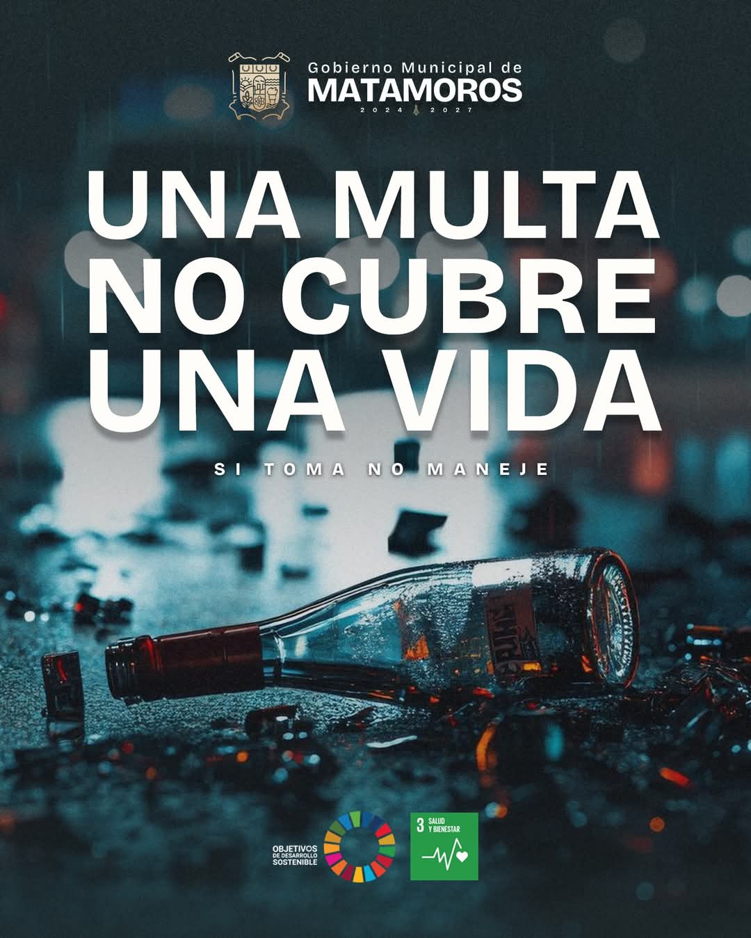 H. Matamoros, Tamaulipas.- Con el firme compromiso de proteger la integridad de las familias matamorenses, el Gobierno Municipal hace un llamado a la ciudadanía a evitar conducir bajo los efectos del alcohol. Bajo el lema “Una multa no cubre una vida”, se exhorta a las y los conductores a tomar decisiones responsables y prevenir accidentes que pueden tener consecuencias fatales.