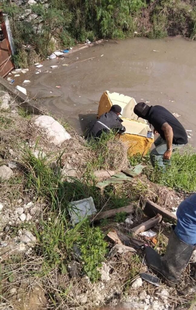 H.Matamoros, Tamaulipas.- El Gobierno Municipal de Matamoros, realizó trabajos de limpieza en el dren de la Avenida Marte R. Gómez; en los cuales; se encontró un refrigerador que impedía el flujo del agua, causando encharcamientos.