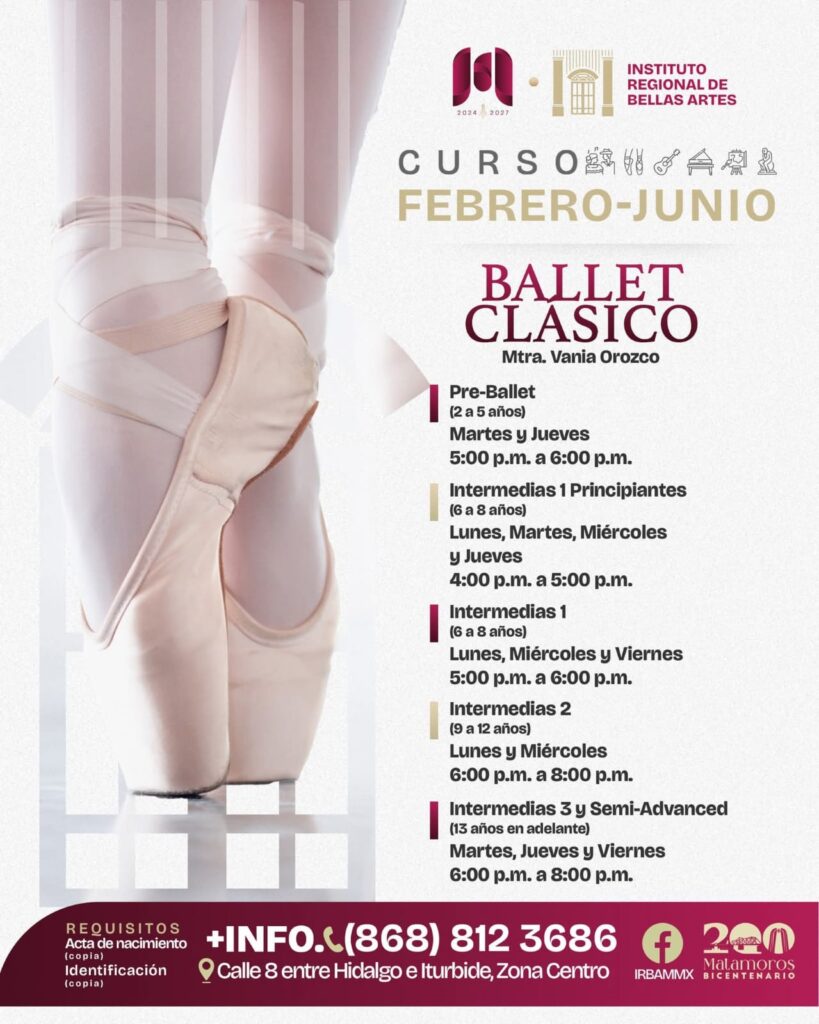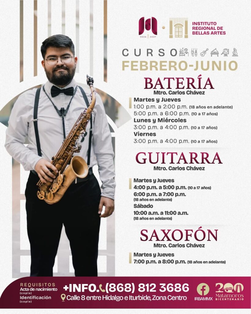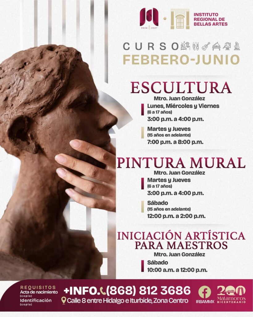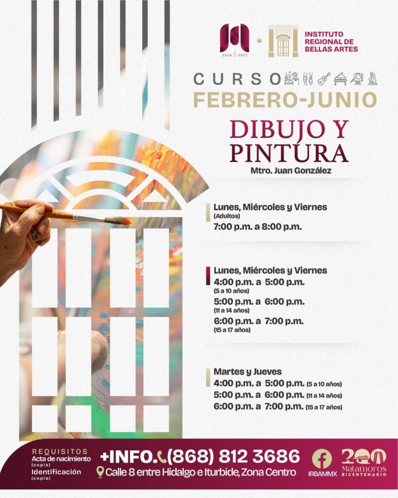 Matamoros, Tam.- El Gobierno de Beto Granados, a través del Instituto Regional de Bellas Artes Matamoros, informó sobre la apertura de inscripciones para el periodo febrero–junio 2026, como parte de su estrategia para fortalecer la cultura y el desarrollo artístico en la ciudad, impulsando acciones para que brille Matamoros.