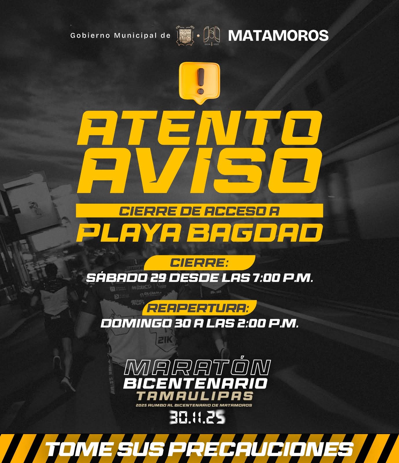 Matamoros, Tam.- El Gobierno de Beto Granados informa que, como parte de la logística del Maratón Rumbo al Bicentenario Matamoros 2025, el acceso a la Playa Bagdad permanecerá temporalmente restringido durante el próximo fin de semana.