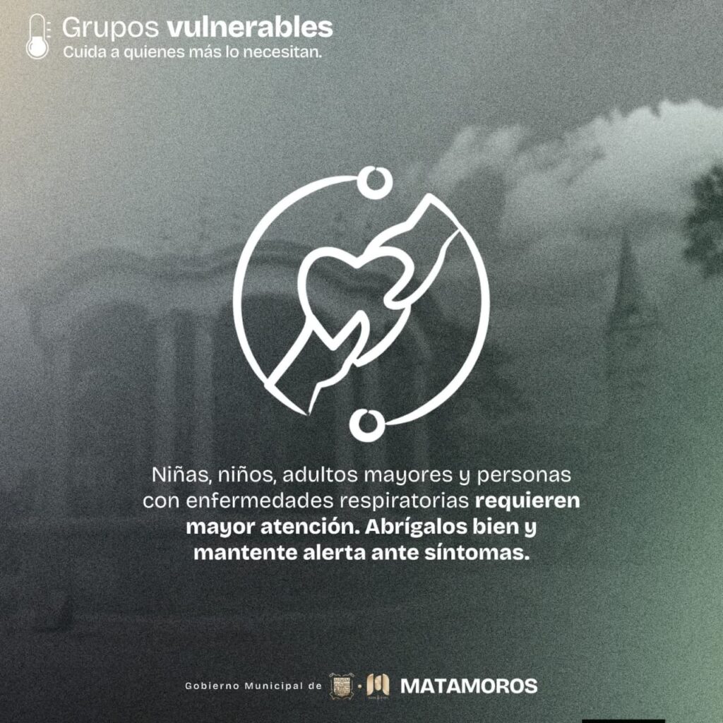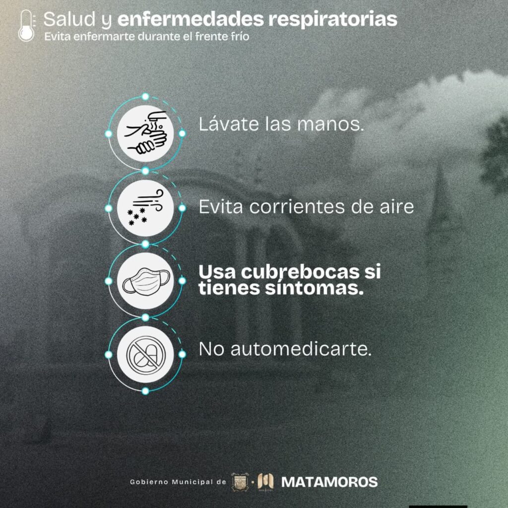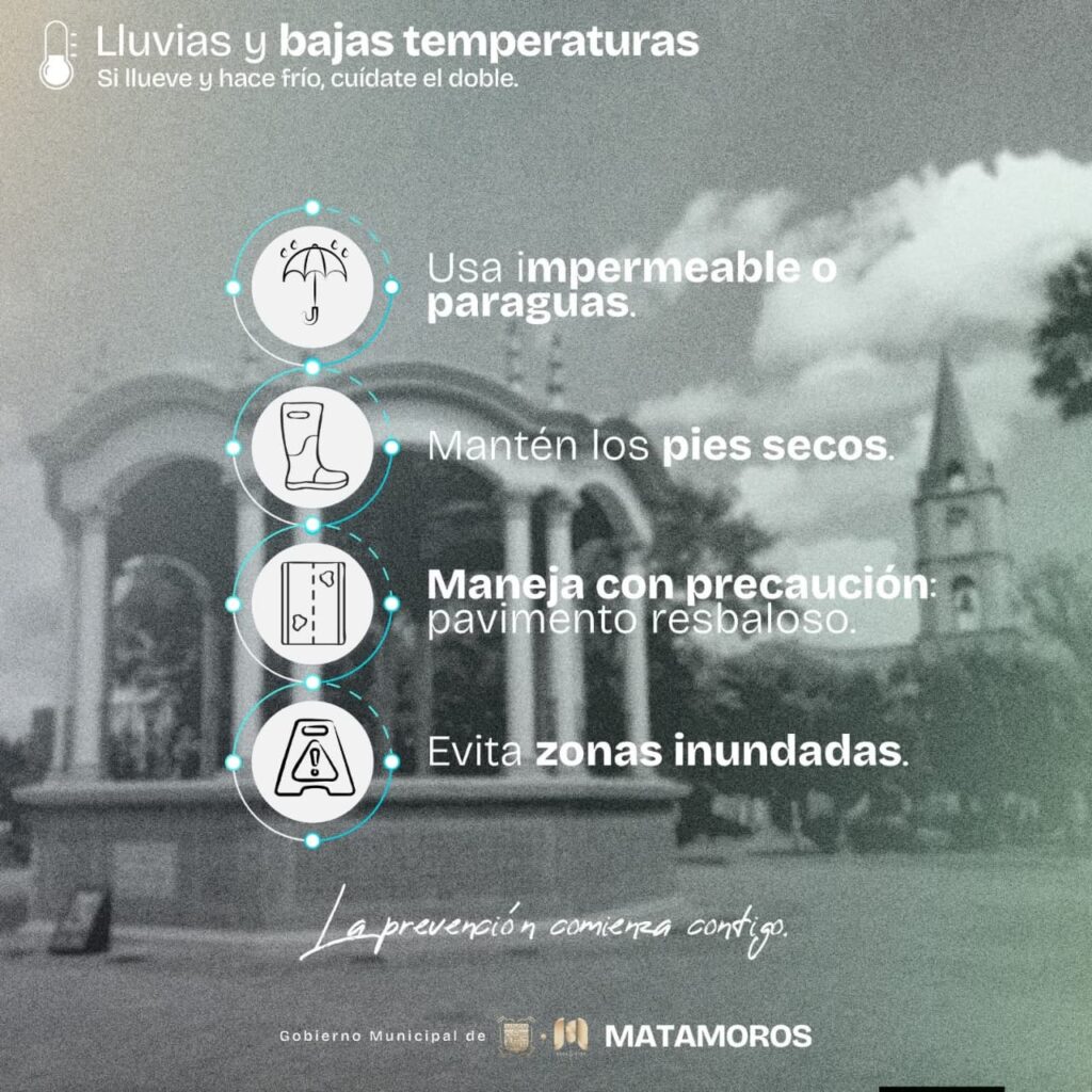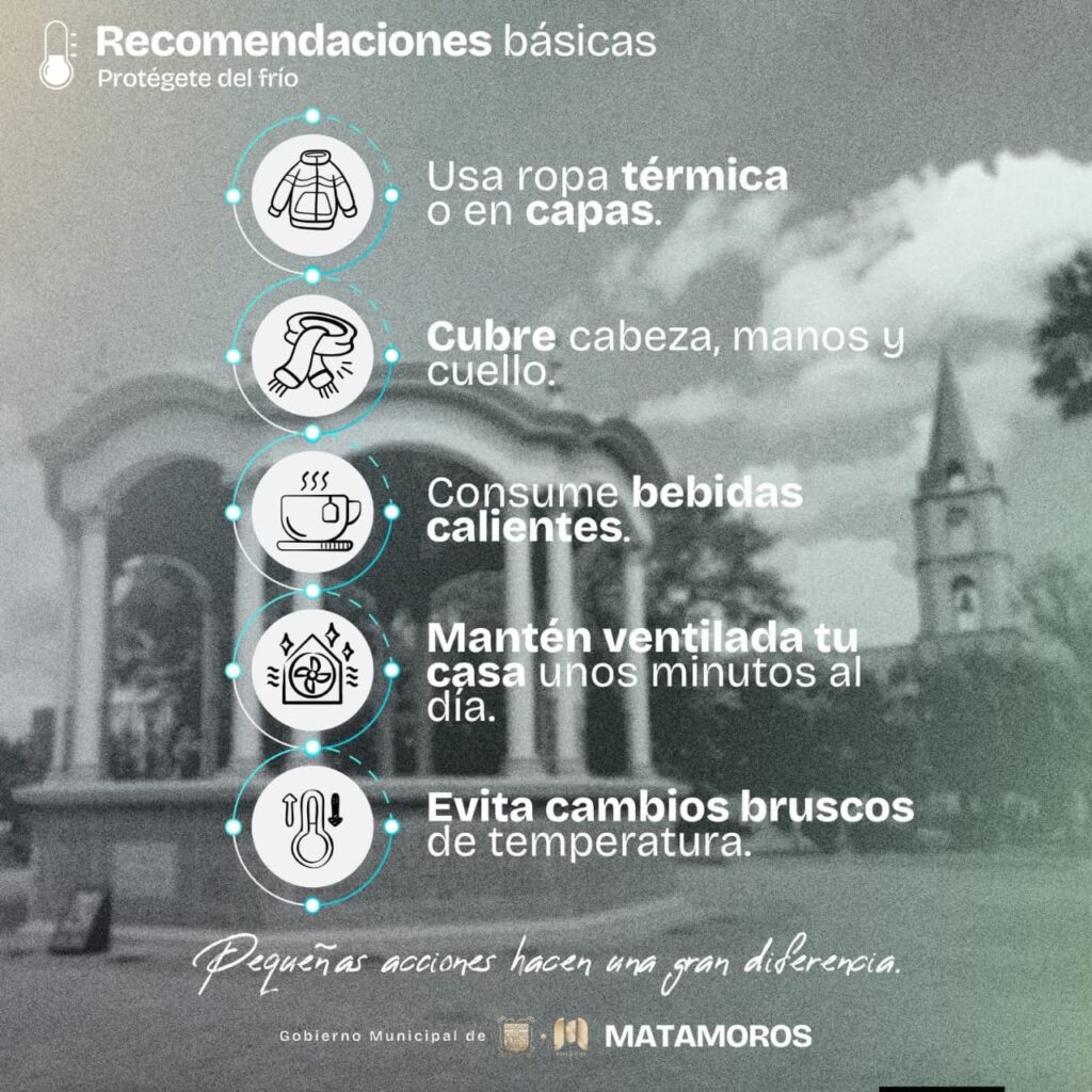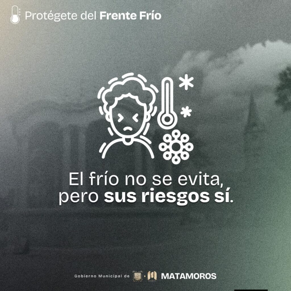 H. Matamoros, Tamaulipas.- Ante la llegada de un frente frío, el Gobierno Municipal, encabezado por el alcalde Beto Granados, exhorta a la ciudadanía a tomar precauciones y mantenerse informada. Los cambios bruscos de temperatura pueden afectar la salud y la movilidad, por lo que actuar con prevención es fundamental para el bienestar de todos
