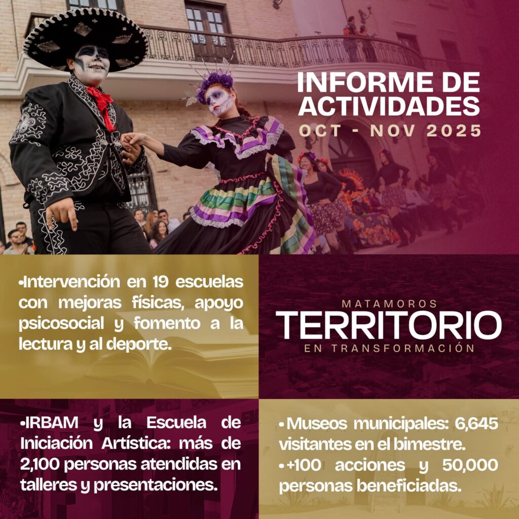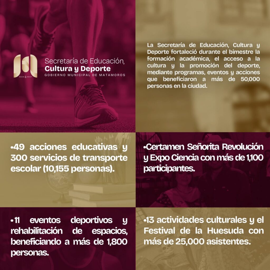 Matamoros, Tam.- El Gobierno de Beto Granados continúa impulsando acciones estratégicas que fortalecen el desarrollo integral de la ciudad, a través del trabajo realizado por la Secretaría de Educación, Cultura y Deporte, con el objetivo de ampliar oportunidades, mejorar la calidad de vida y consolidar un entorno más justo y participativo.